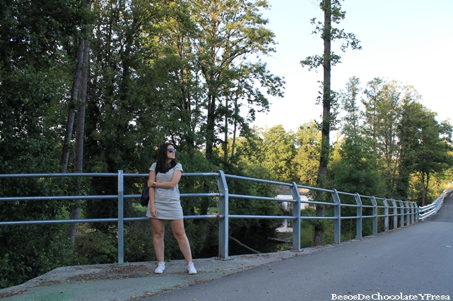 En este caso para ir a dar un paseo y luego ir de terrazas, llevé un vestido de rayas marineras en crudo y marino de Zara Kids , con converse, collar de flores con brillos de Lefties para darle el toque chic y la mochila al hombro.
