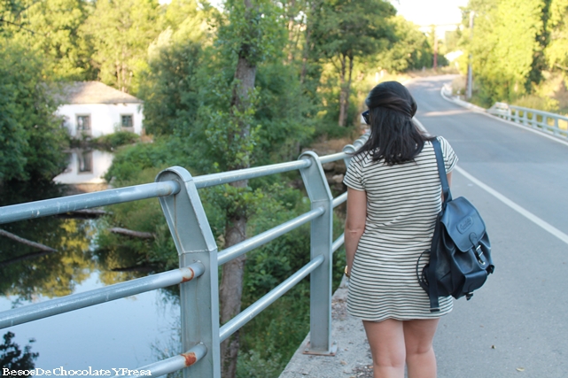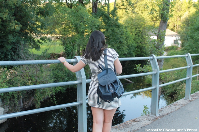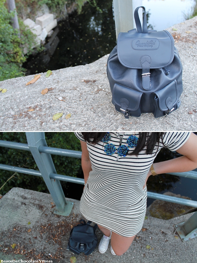In this case to go for a walk and then go terraces, I wore a dress of raw sailor stripes and dark, with converse flower necklace with glitter to give the chic and backpack.
