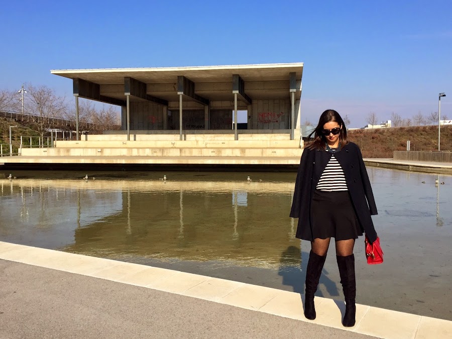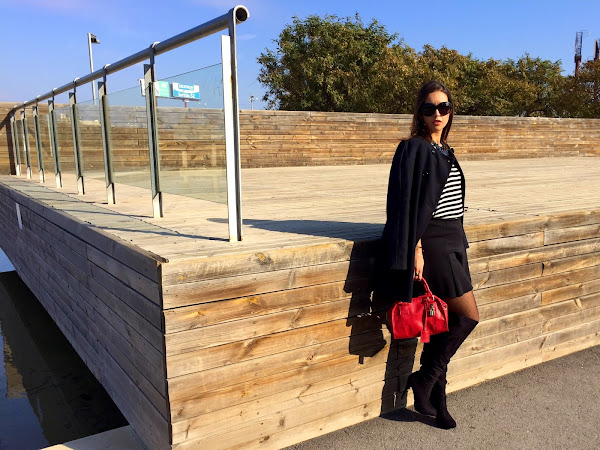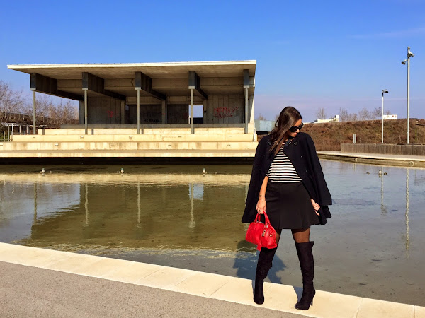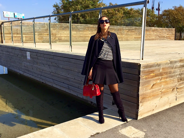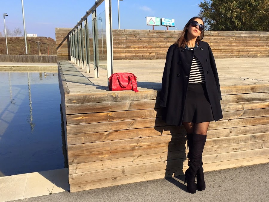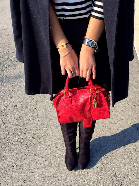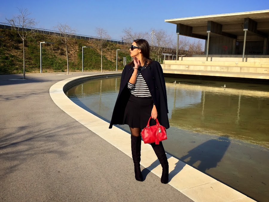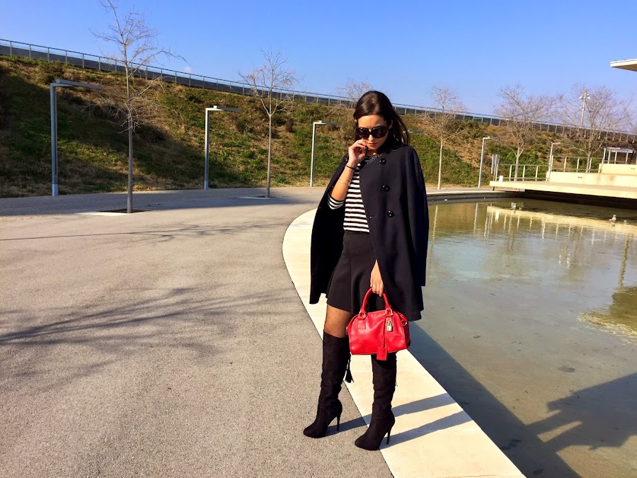 !Buenas noches sweeties! Último post de la semana y esperando que llegue el finde. Hoy os enseño el look que lleve el pasado sábado para ir de compras, un look muy chic. En él look de hoy llevo camiseta de rayas, con falda negra y abrigo estilo capa. Para completar el look me puse mis botas XL y mi bolso rojo para dar un toque de color. Un look sencillo, con prendas que todas tenemos en nuestros armarios y a la vez, muy chic.