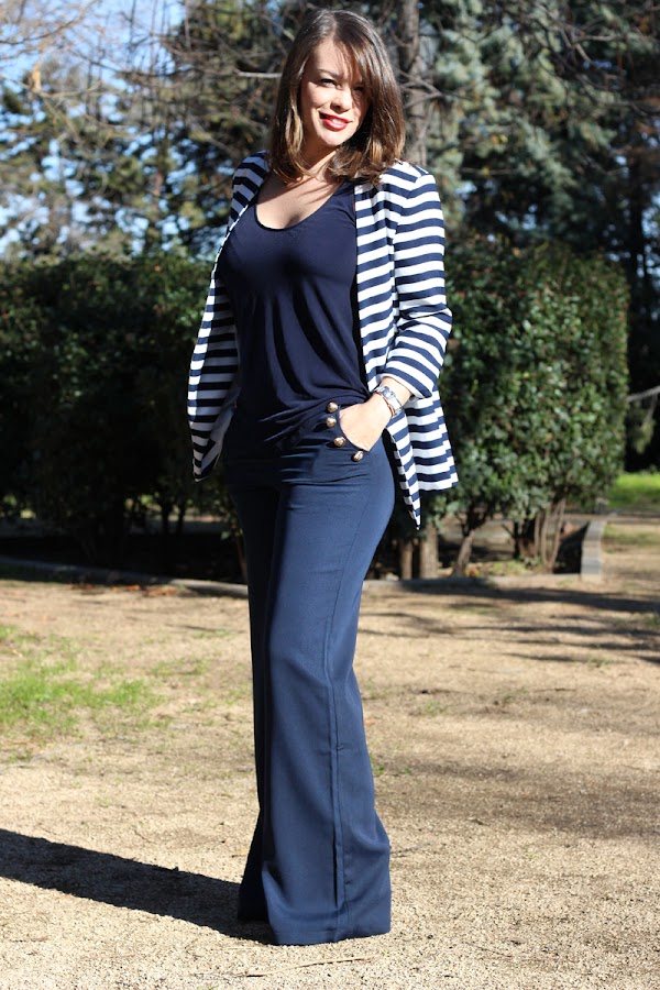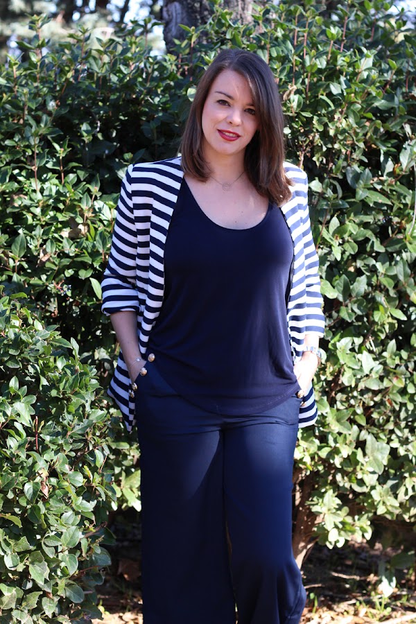 El pantalón es muy cómodo y notaba que me estilizaba bastante la figura y eso que me costó decidirme a cogerlos porque son un tipo de pantalones que los he llevado hace muchos años y ahora, como que con tanto pitillo no sabría si me vería con ellos, pero nada más llegar y probármelos, me enamoraron, además de que me parecen muy elegantes y el toque de los botones dorados en la línea de los bolsillos me encanta, le da un toque marinero muy chulo, ¡que fan soy yo del estilo navy!