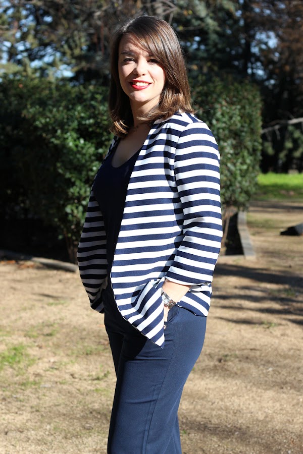 Combiné el pantalón con una camiseta de tirantes del mismo tono y blazer de rallas marineras en blanco y azul marino. Los botines son marrones pero sólo se les veía la parte delantera al andar, en las fotos, se cubren totalmente con el pantalón.
