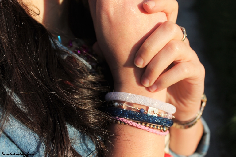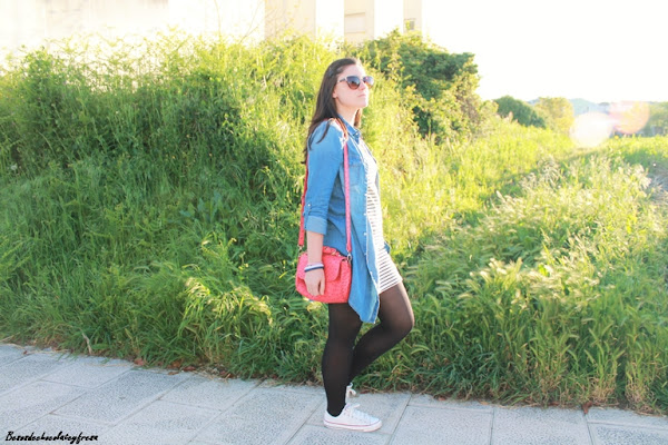 Llevo vestido navy con maxi camisa denim, sneakers para hacer un look totalmente cómodo, bolso rosa con piel de avestruz a juego con el collar joya de metacrilato. Además incluí mis nuevas pulseras de V&L en azul y blanco de redecilla con cristalitos en el interior.