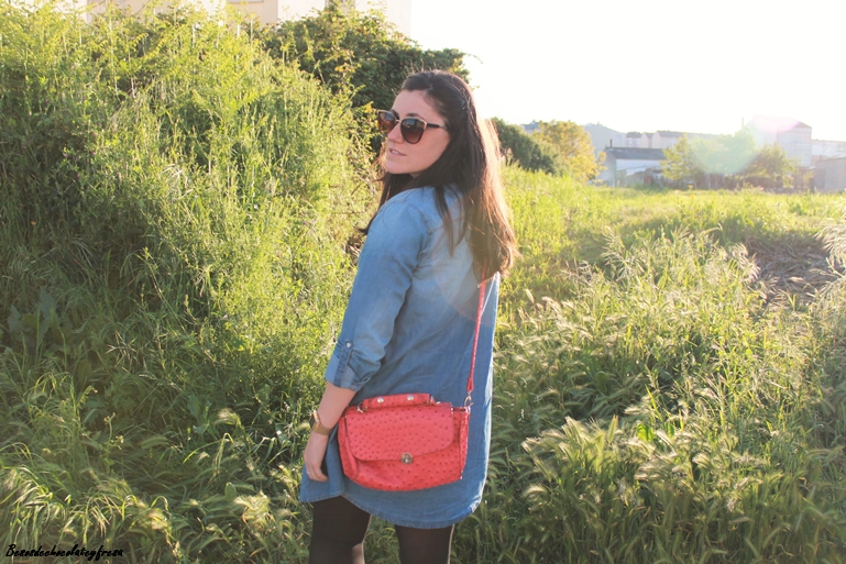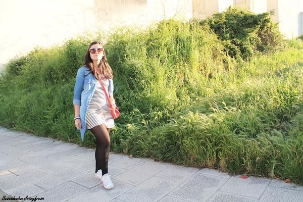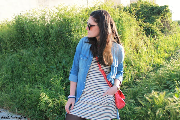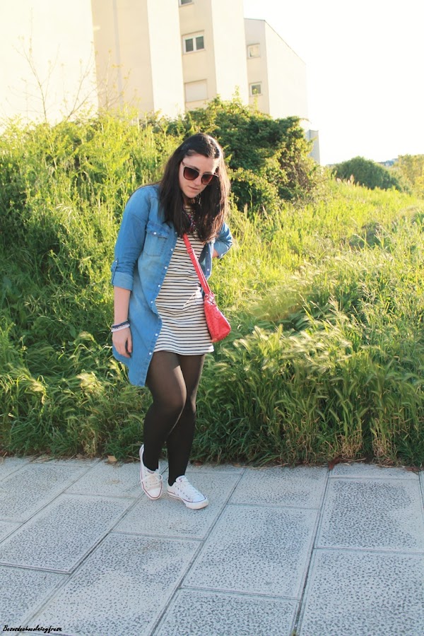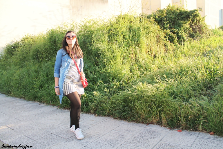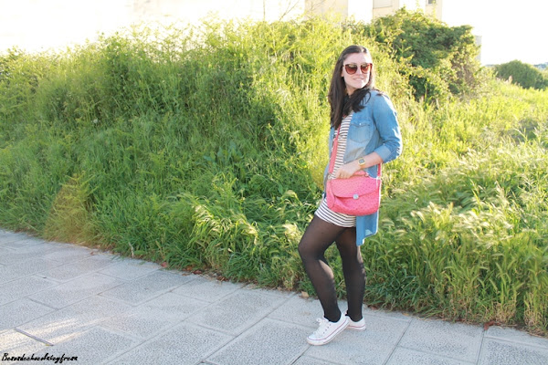Ive been dress navy with maxi shirt denim, sneakers to create a completely comfortable look, pink bag with leather of ostrich game with methacrylate jewel collar. I also included my new V & L bracelets in blue and white NET with small crystals in the interior.