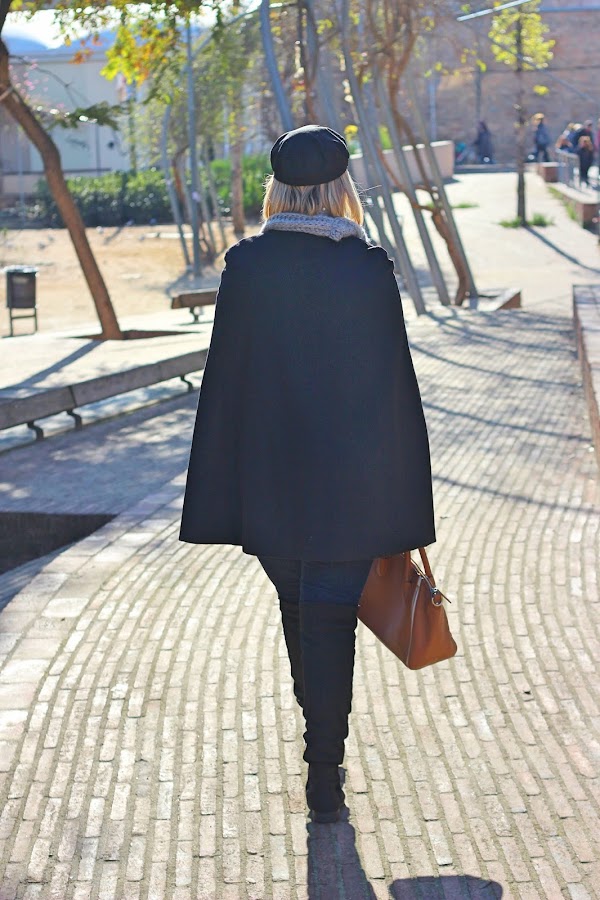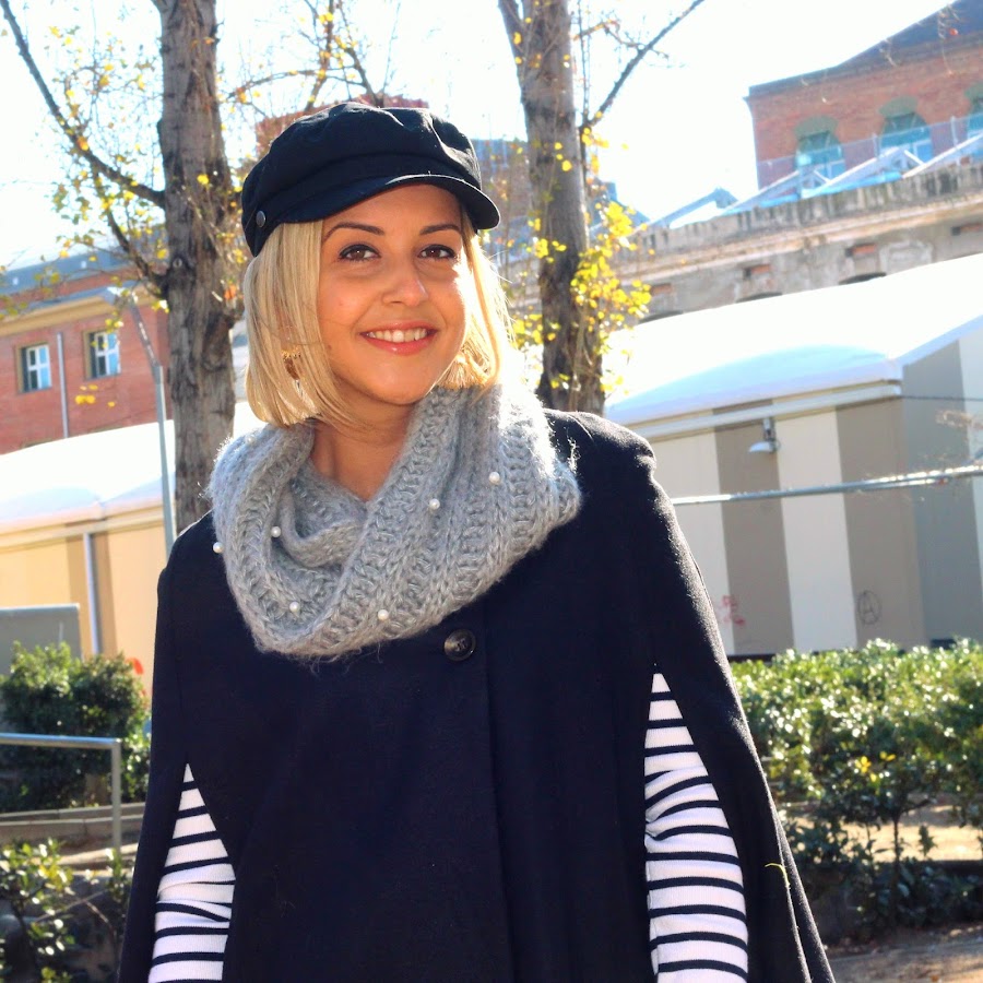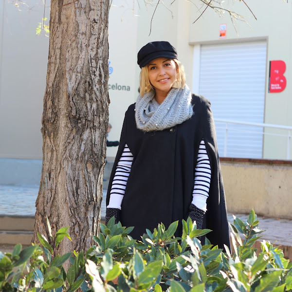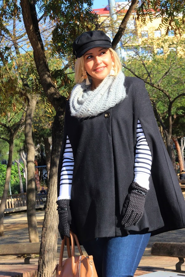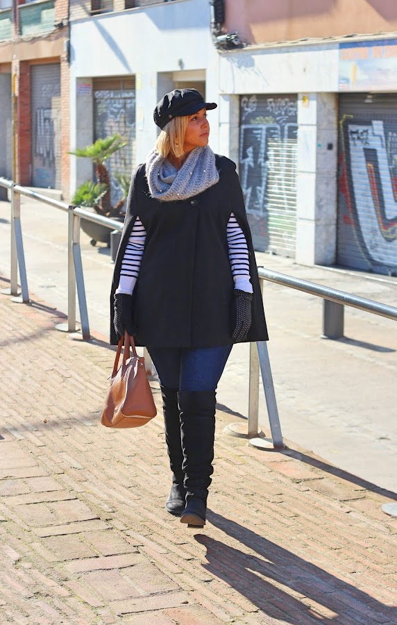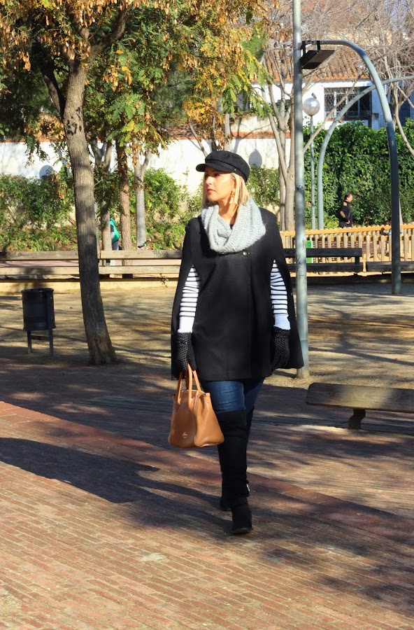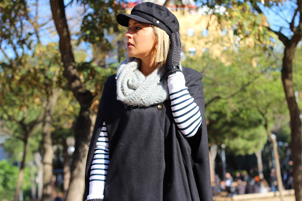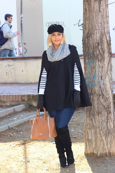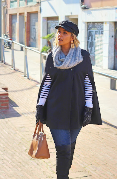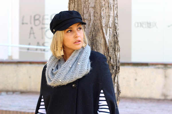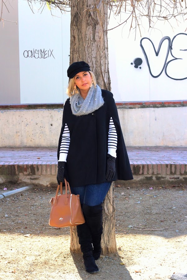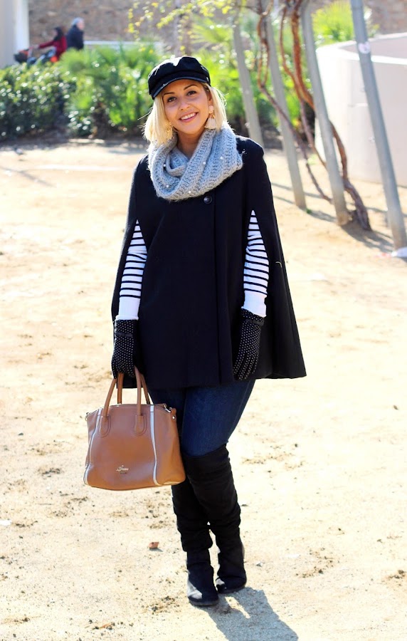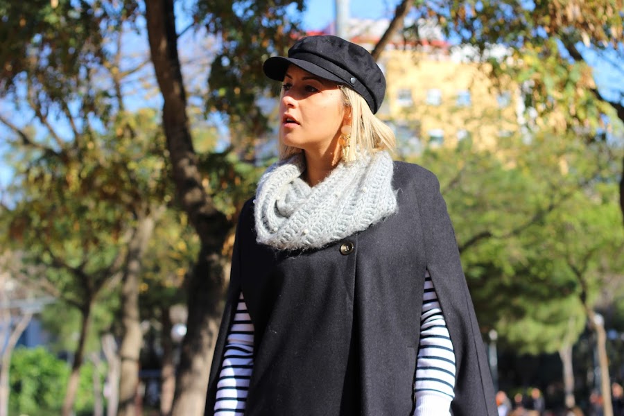 Hoy os traigo un look casual chic donde los protagonistas sin duda son los complementos. En el look de hoy llevo un jersey de estilo marinero que combiné con unos jeans y una capa. Los accesorios del look fueron mis botas por encima de la rodilla, un bolso beige de Guess, un cuello gris con perlas y sin duda, la protagonista de este look es mi gorra de estilo marinero, super tendencia esta temporada, y mis maxi pendientes. Un look perfecto para ir cómoda y chic durante el fin de semana.