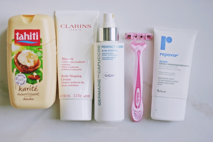 Llevo Masvelt, de Clarins, una crema remodeladora que deja la piel increíblemente suave y tersa, y me viene genial para las piernas.