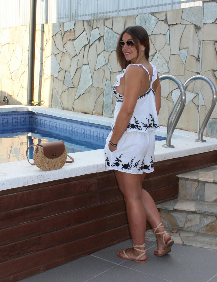 Aunque sí que es verdad que esta unión de colores cambia bastante de invierno a verano, en la época más fría predomina más el color oscuro, mientras que en la época estival el protagonismo se lo lleva el blanco. Esta segunda opción es la que está basada mi look de hoy en la que a no ser por los bonitos bordados que adornan el conjunto, podría ser considerado un total white. El tamden está compuesto por cuerpo y shorts en blanco, ambos adornados en las partes bajas y en el escote con bonitas flores en negro.