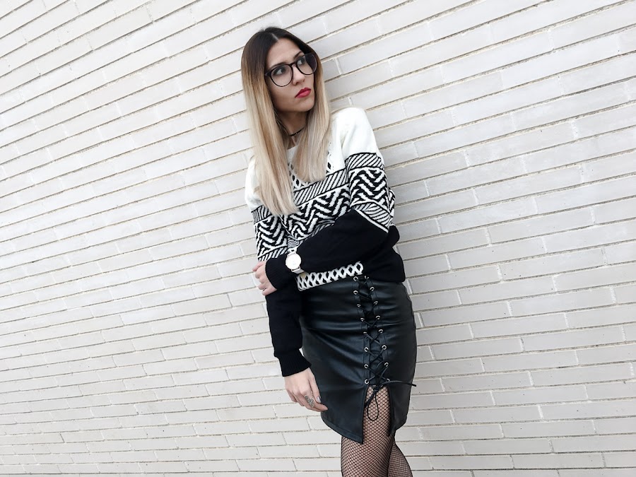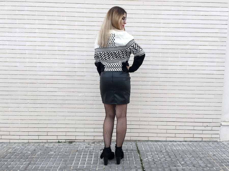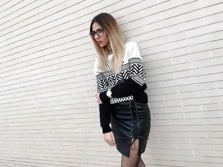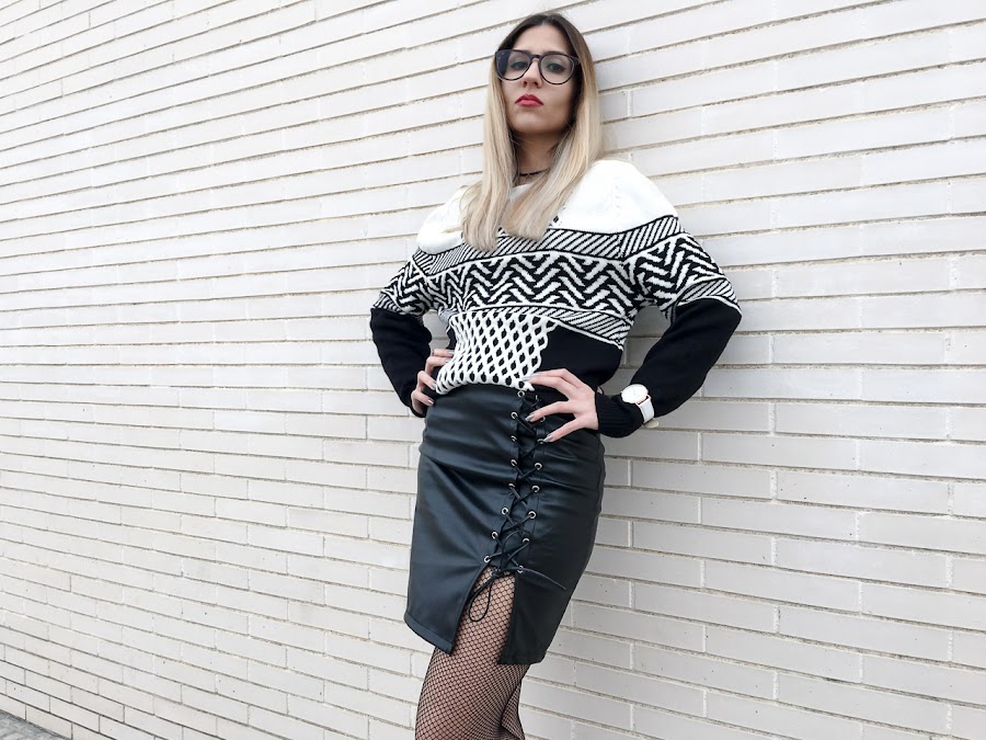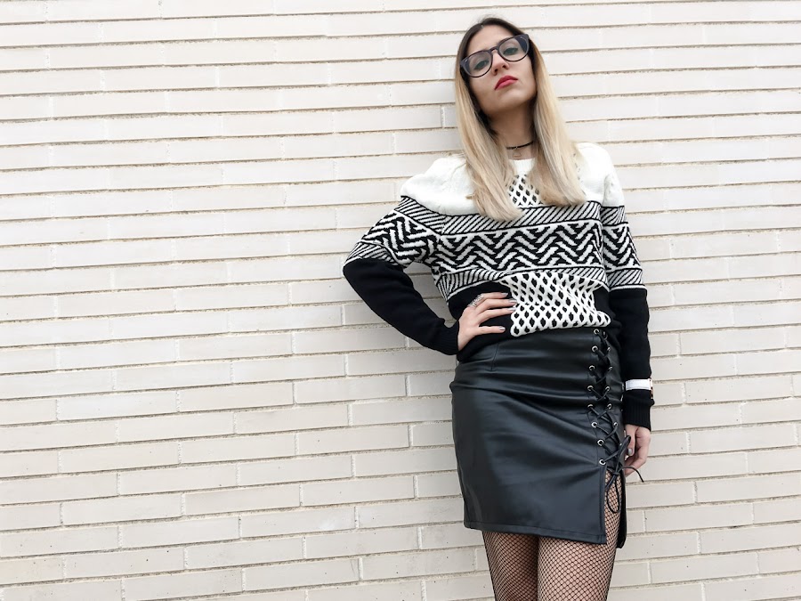 El look de hoy es un total look en blanco y negro con un jersey oversize de punto en blanco y negro, súper calentito y una falda negra de polipiel con un cordón lateral que le da un toque muy rockero al look!
