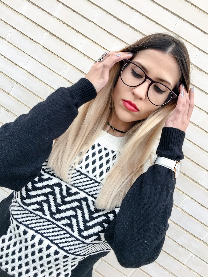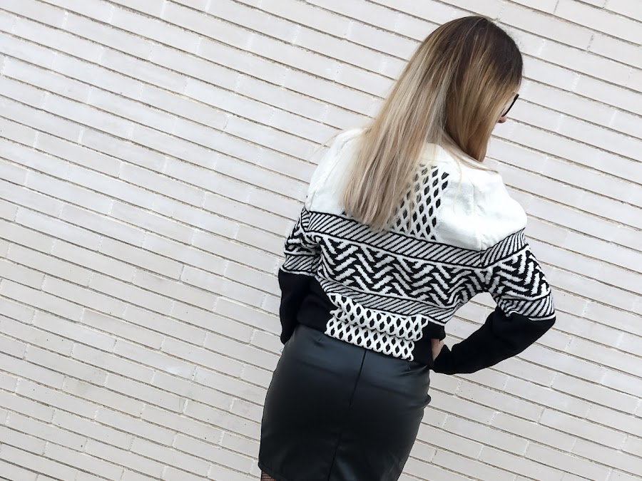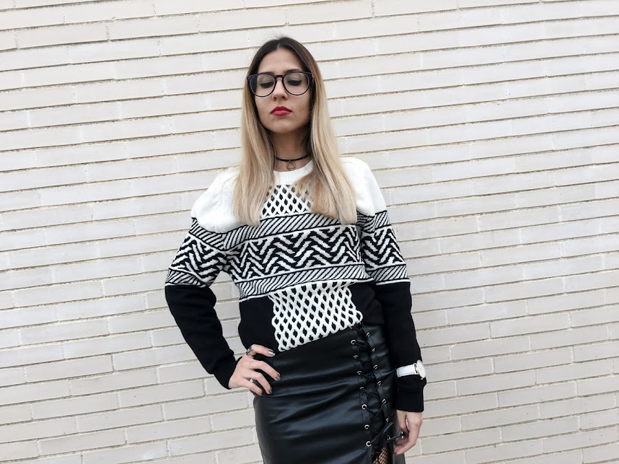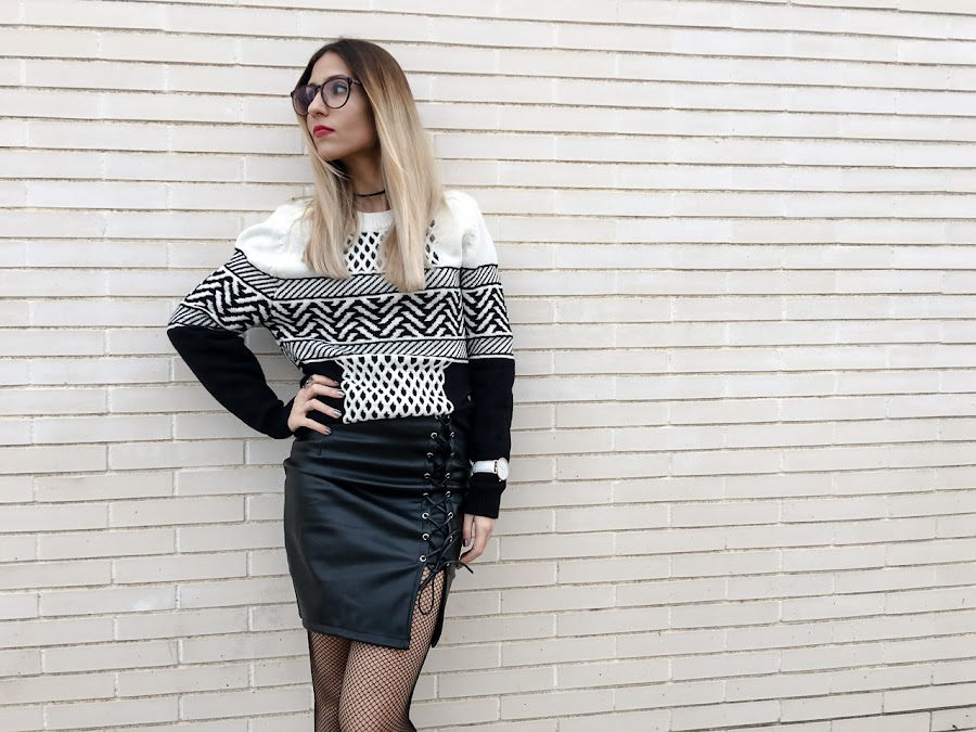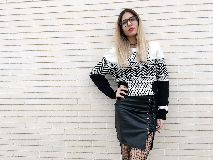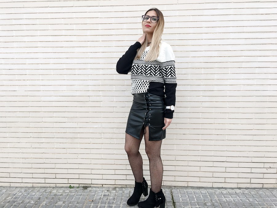 El look de hoy es un total look en blanco y negro con un jersey oversize de punto en blanco y negro, súper calentito y una falda negra de polipiel con un cordón lateral que le da un toque muy rockero al look!