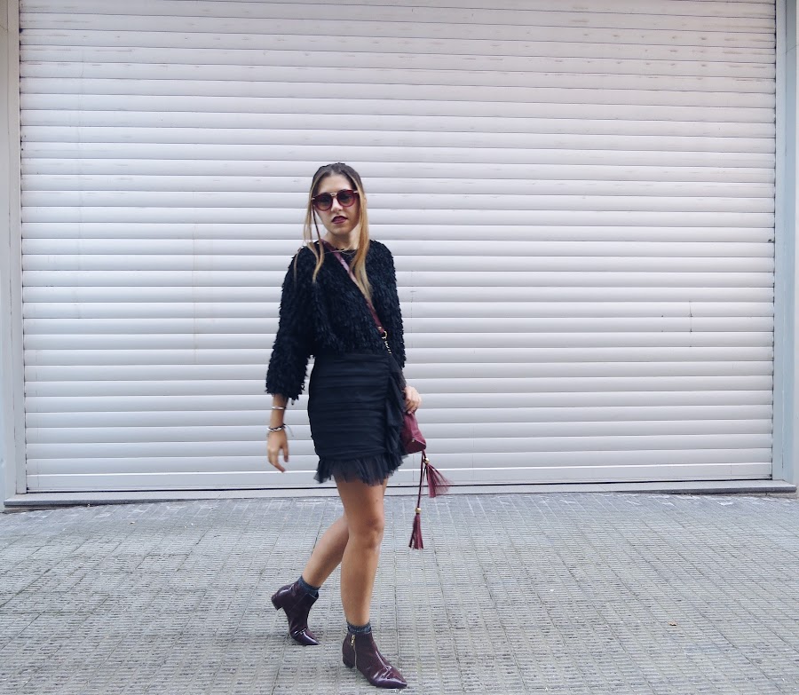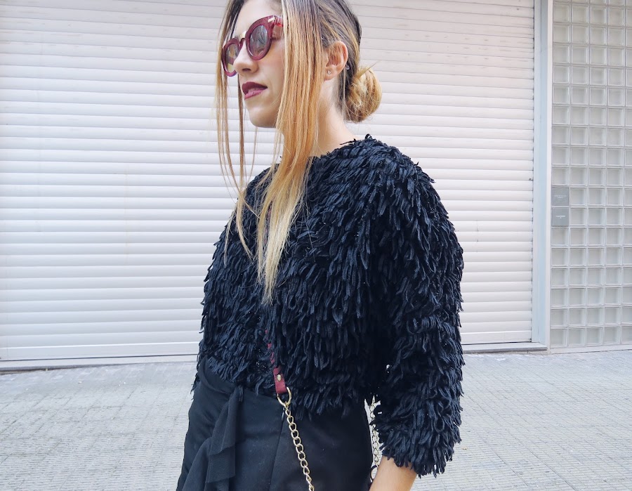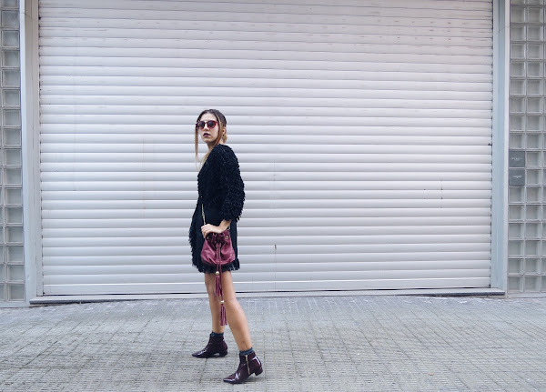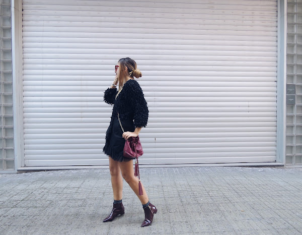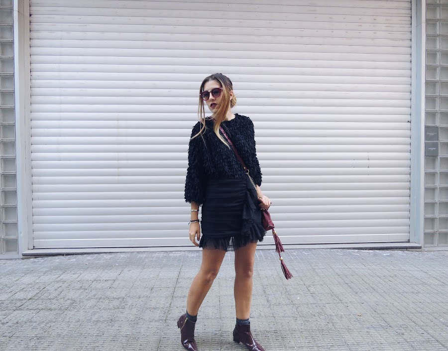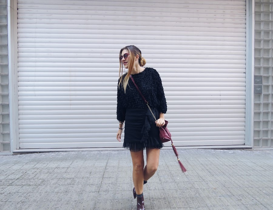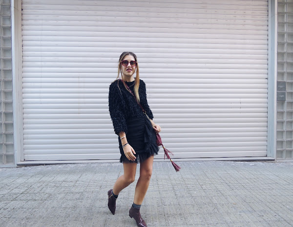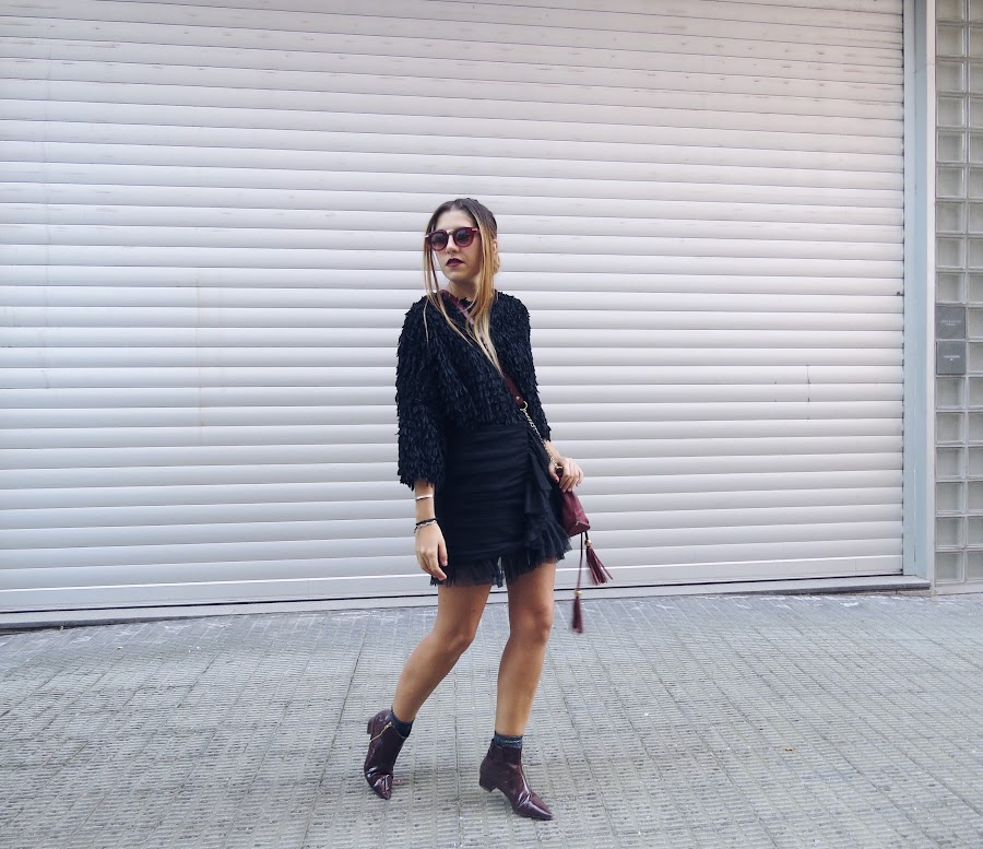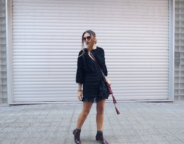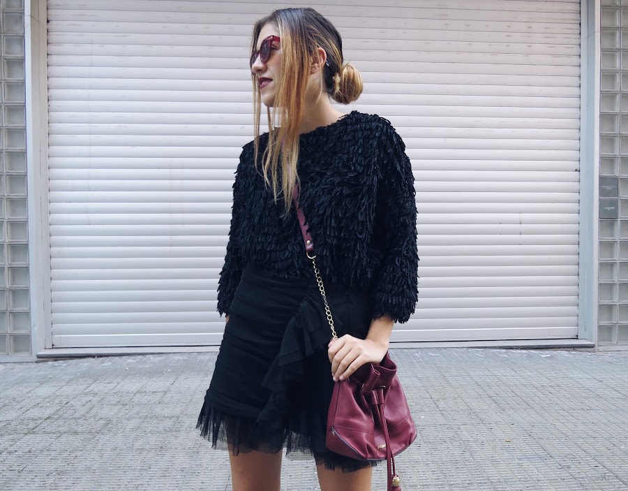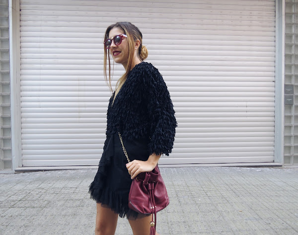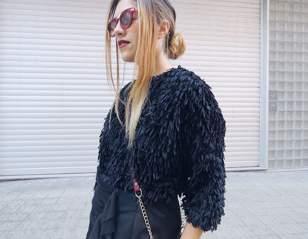 Me encanta mezclar texturas, y en el look de hoy la mezcla es explosiva, el tull fruncido con los flecos del jersey, crea un look con mucho rollo.