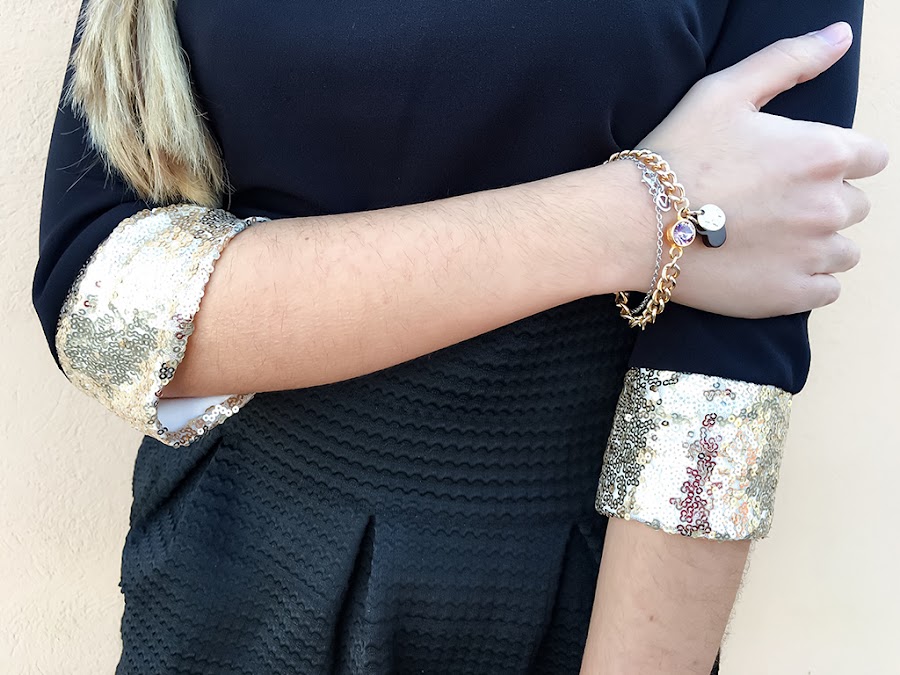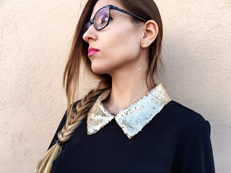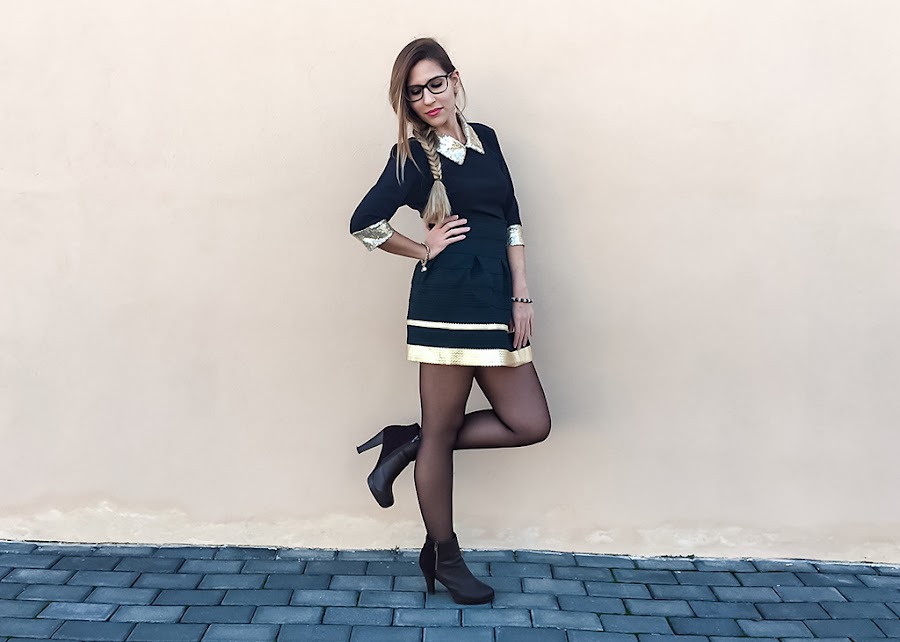 Para la parte de arriba he elegido una blusa negra con el cuello y el borde de las mangas con lentejuelas doradas haciendo juego con la falda.