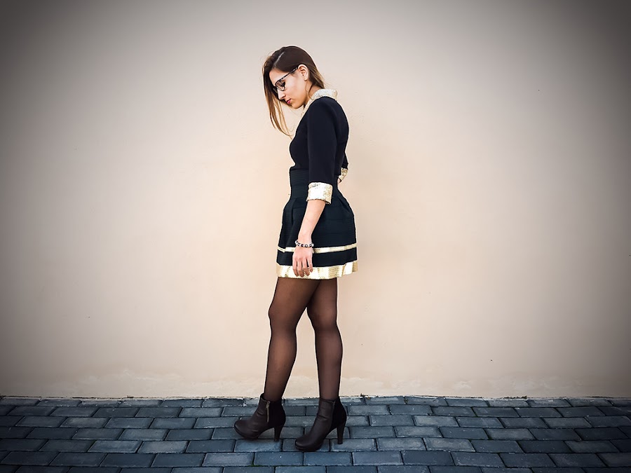 Y de nuevo combino el negro con el dorado. Me encanta esta combinación, porque el color dorado le da mucha alegría al negro y se hace destacar aún más. Esta vez he elegido una falda globo negra con el filo dorado y con una especie de relieve que queda genial. Es la falda perfecta!