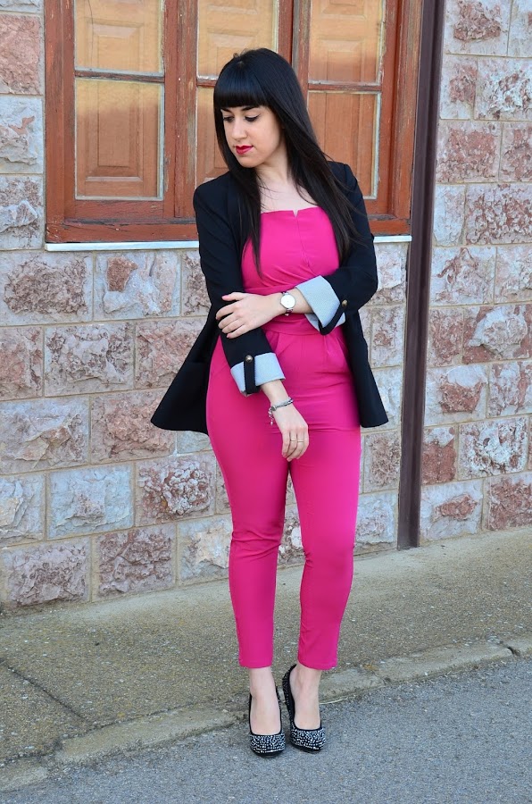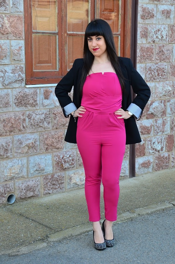 Bueno no me enrollo mas y vamos con el look de hoy, en tonos negros y fucsia. El mono es una maravilla, elástico y con un escote que lo hace muy femenino. Yo que soy "anti" no llevar sujetador, en esta ocasión he de decir que el mono es comodísimo, además tiene varillas para aportar mayor sujeción.