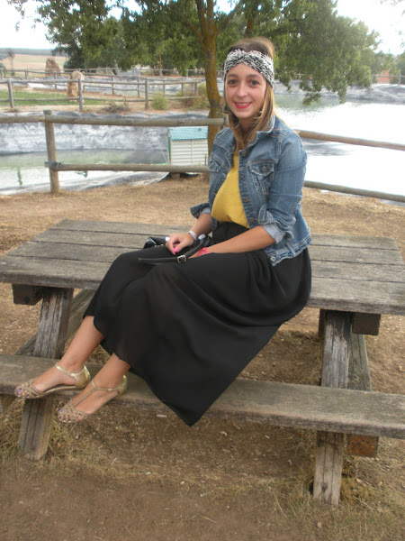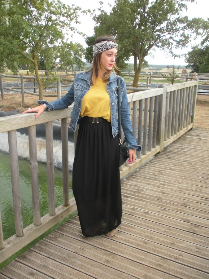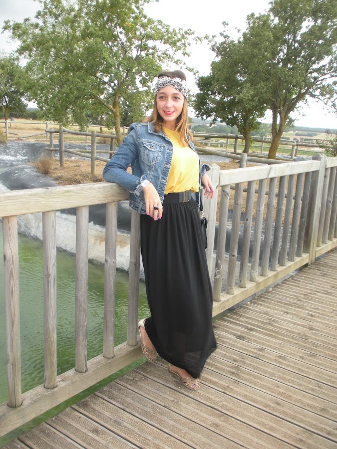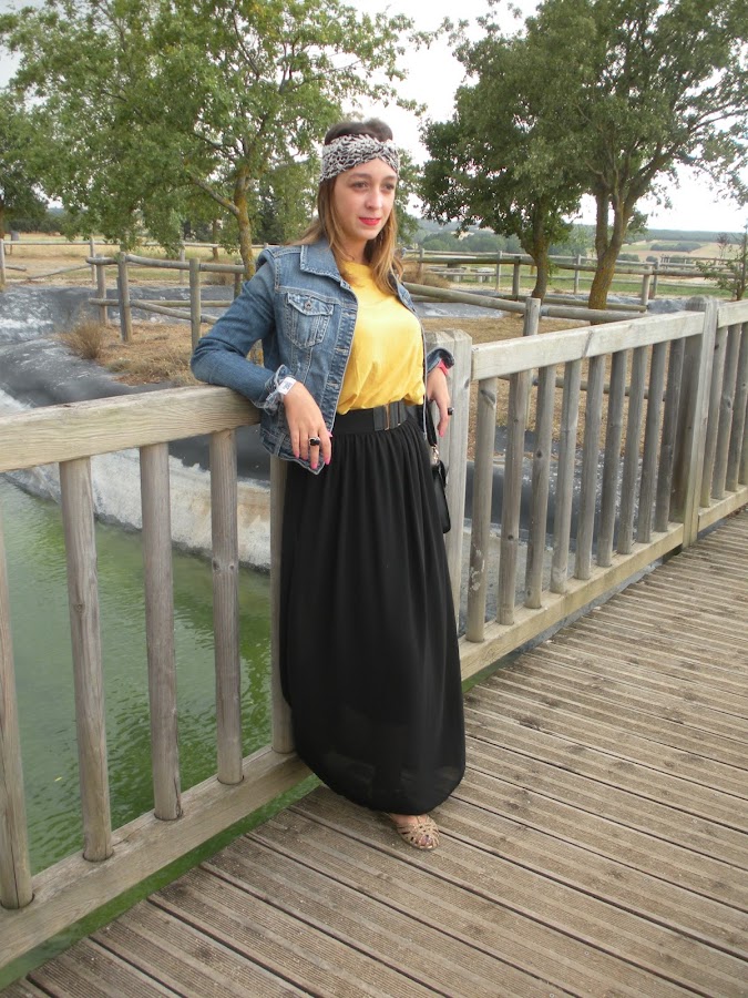 Y después de esta parrafada vamos con el look. Negro y mostaza: dos colores que me encantan juntos. Una falda larga y un top aderezados con los complementos idóneos.