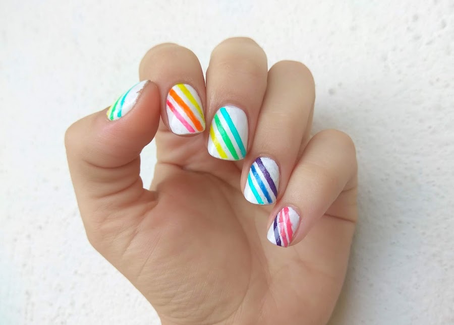 La manicura es muy fácil de hacer. Lo único que necesitamos son colores neón y nail tapes (cinta para las uñas) o cortar celo muy finito.