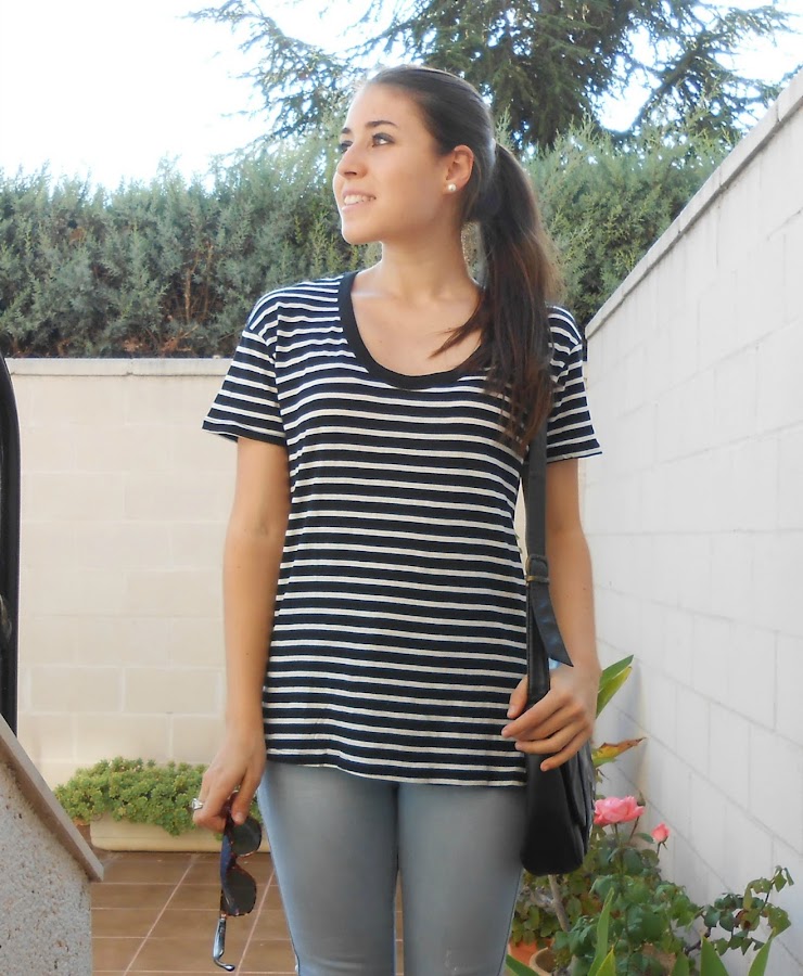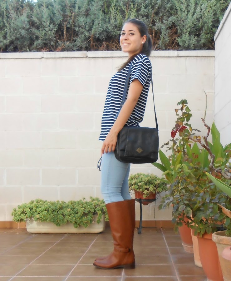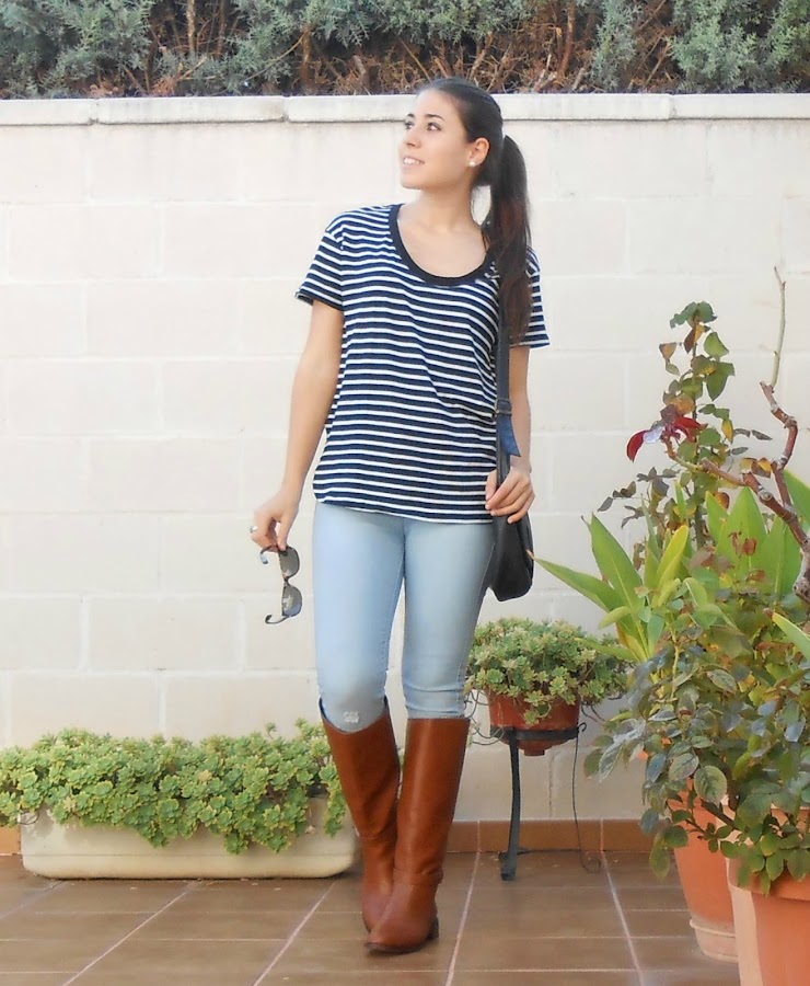 Pues bien, hoy os traigo un look de este estilo. Está compuesto de jeans y camiseta básica. Para completar, le he añadido botas en color marrón, las cuales, tienen detalles a la altura del tobillo; y bolso en negro.