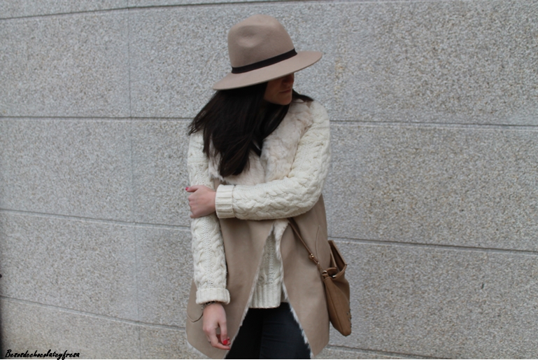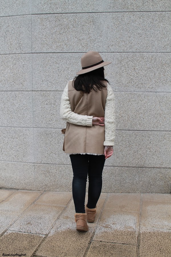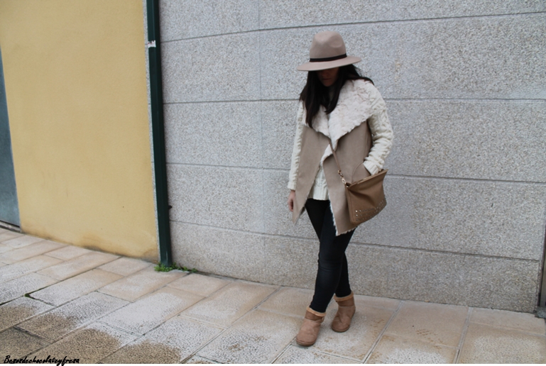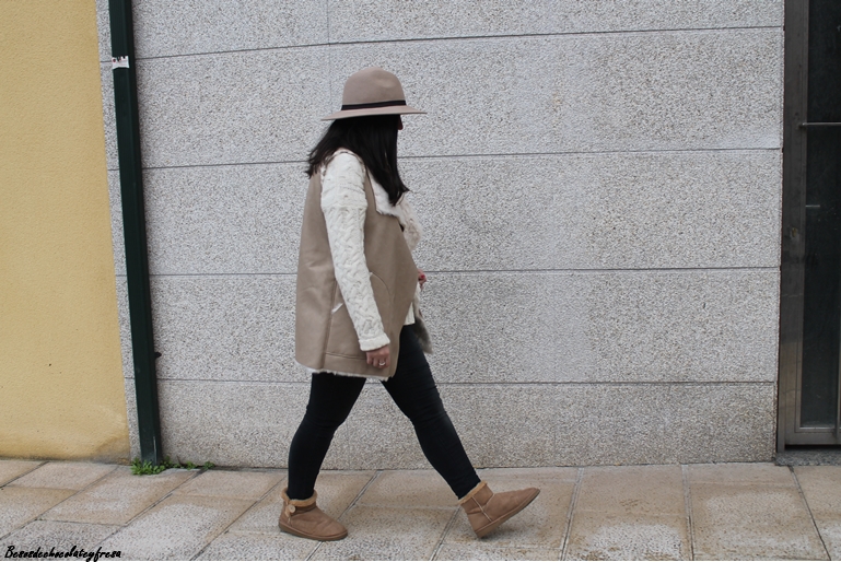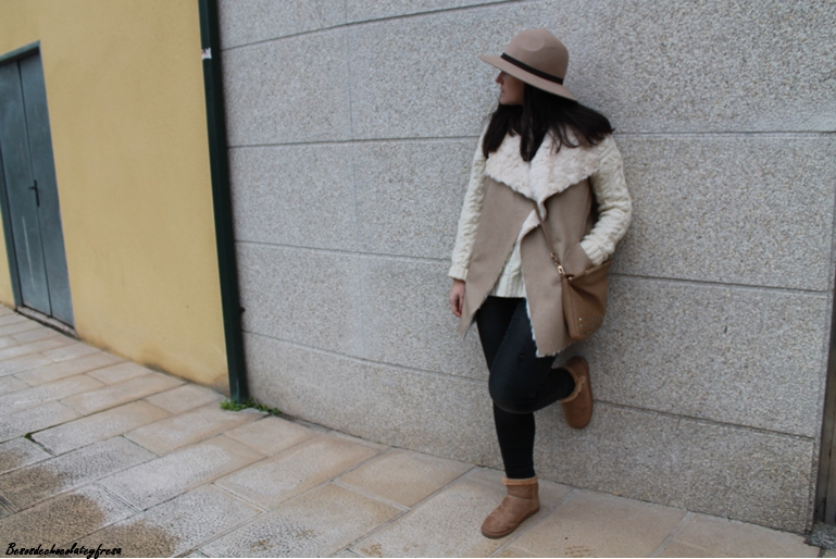 Hoy os muestro un look con mis nuevos jeans de Only, regalo de reyes, en color negro desgastado y con algunos cortes que sienta como un guante. Lo combiné con prendas ya conocidas como sweater en blanco de lana, calentito para estos días de puro frio que tenemos, chaleco de polipiel y peluche que juntos aún dan más calor jejeje y botas tipo Ugg, como complementos bolso bandolera de tachuelas en nude y sombrero.