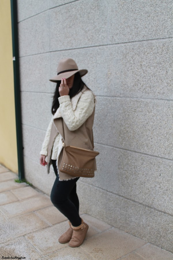 Today I show a look with my new jeans Only, Christmas present, in black and worn with some cuts that fits like a glove. I combined with items already known as white wool sweater, warm for these cold days we have pure, synthetic leather vest stuffed together and still give more heat lol and Ugg boots type, as complements studded shoulder bag and hat nude .