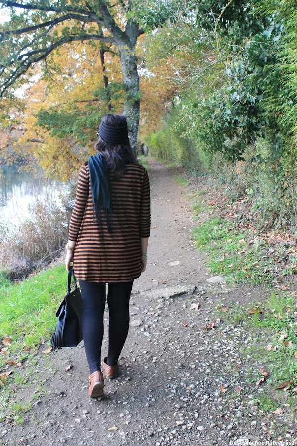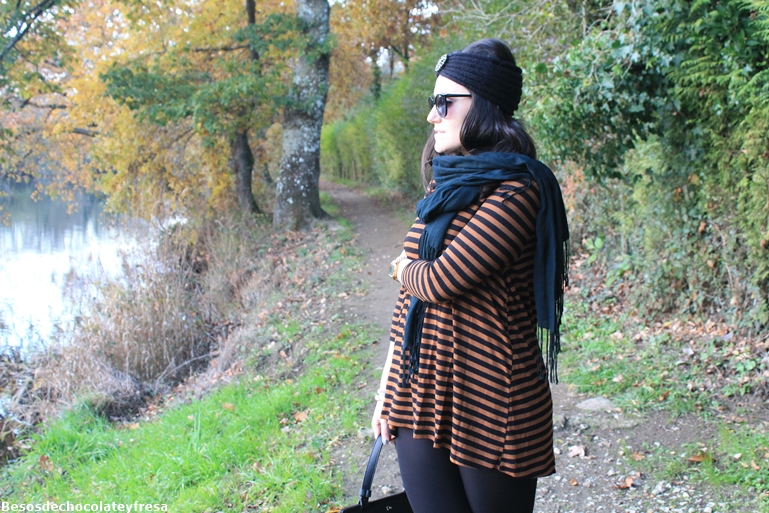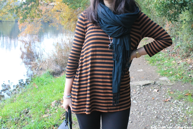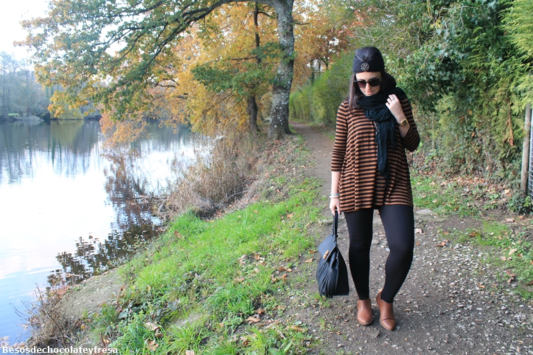 Llevo camiseta de rayas negras y marrones con leggings de Nivea del que ya os hable en este post (AQUÍ) y que os recomiendo, botines marrones y complementos en negro como el fular, turbante, bolso de flecos y collar de Tous.