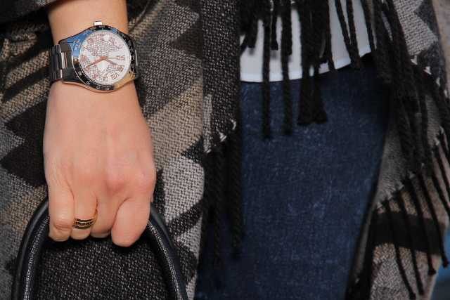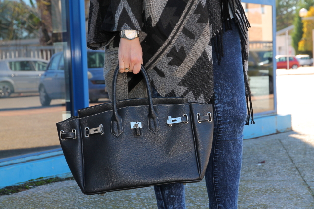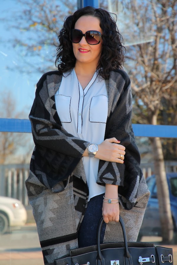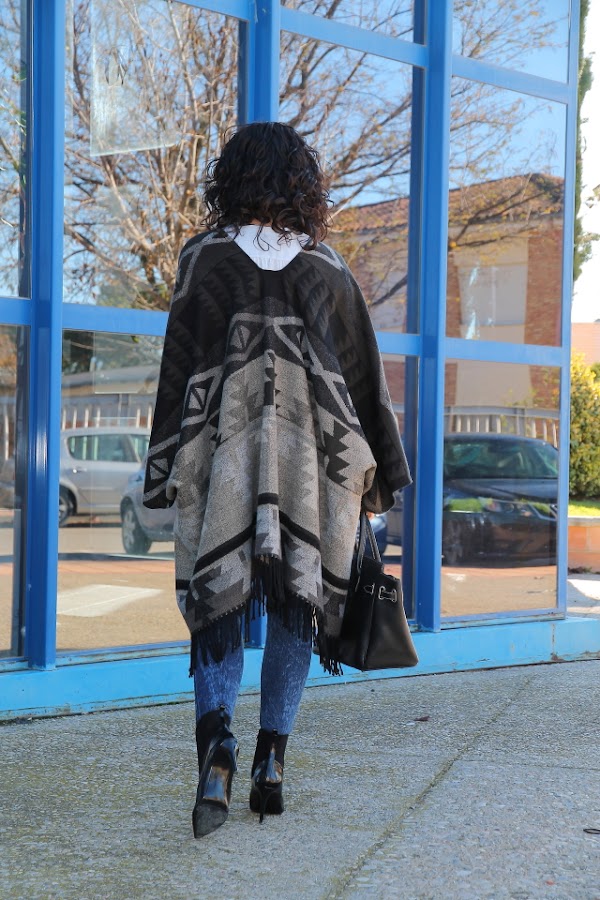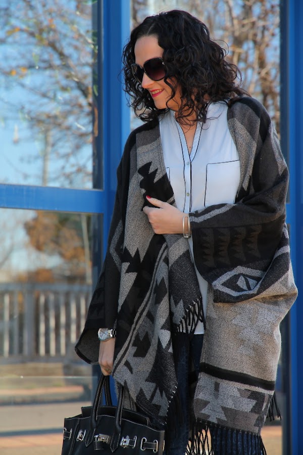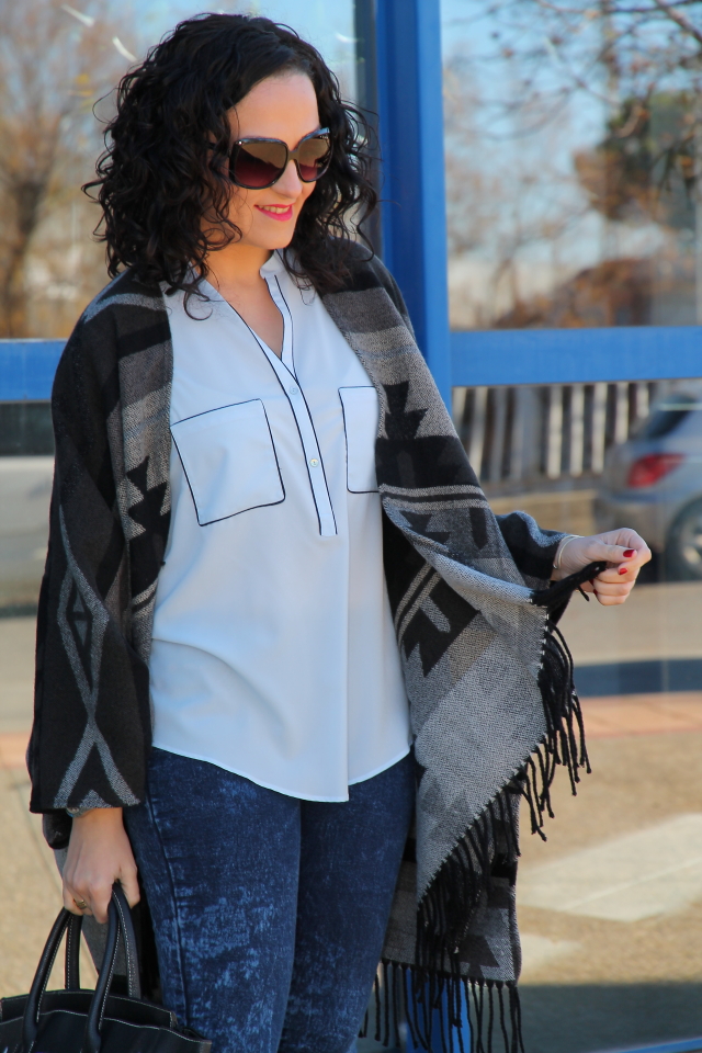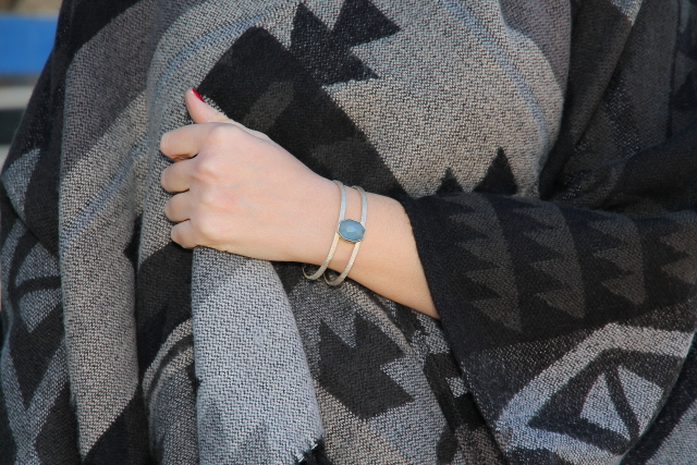 Empiezo la semana con un estilismo que forma parte de mis favoritos gracias a dos piezas del mismo que me encantan, la capa étnica y mis nuevos botines. La capa ya la pudisteis ver aquí, hoy en cambio la llevo en un look en tonos azules con camisa y jeans pitillo lavados al ácido. Los botines de tacón fino y el bolso estilo Birkin de Hermès le aportan ese punto chic que tanto me gusta. Como complemento me he decantado únicamente por una esclava de plata con piedra Calcedonia en el color protagonista del look.