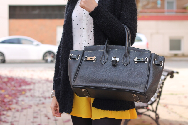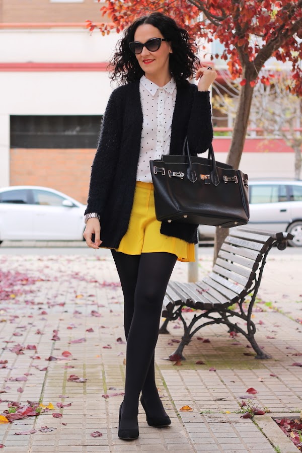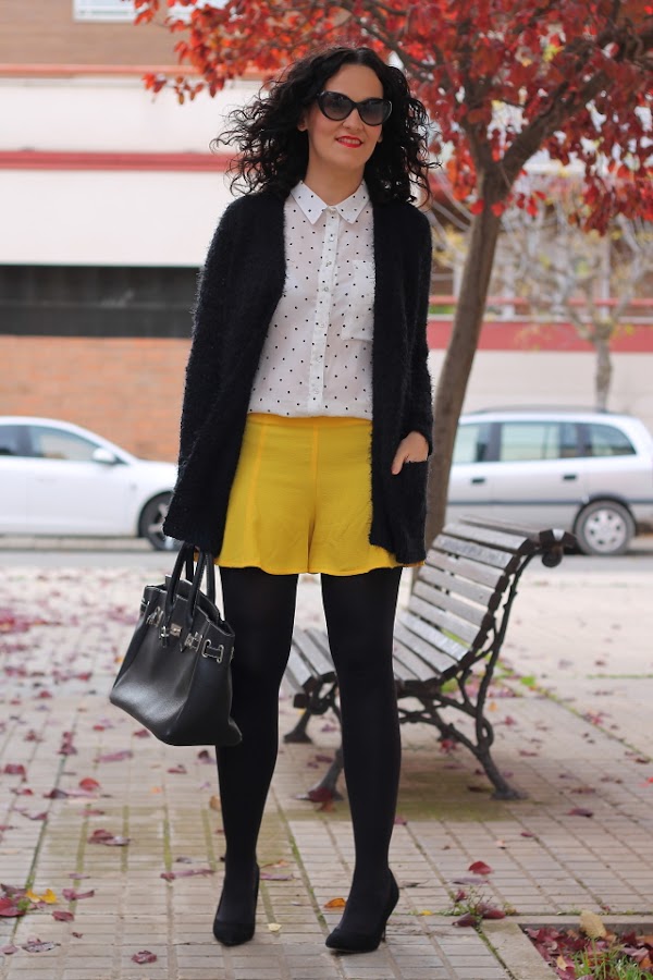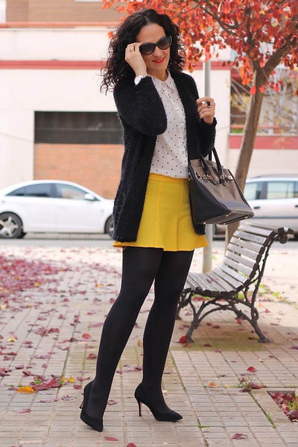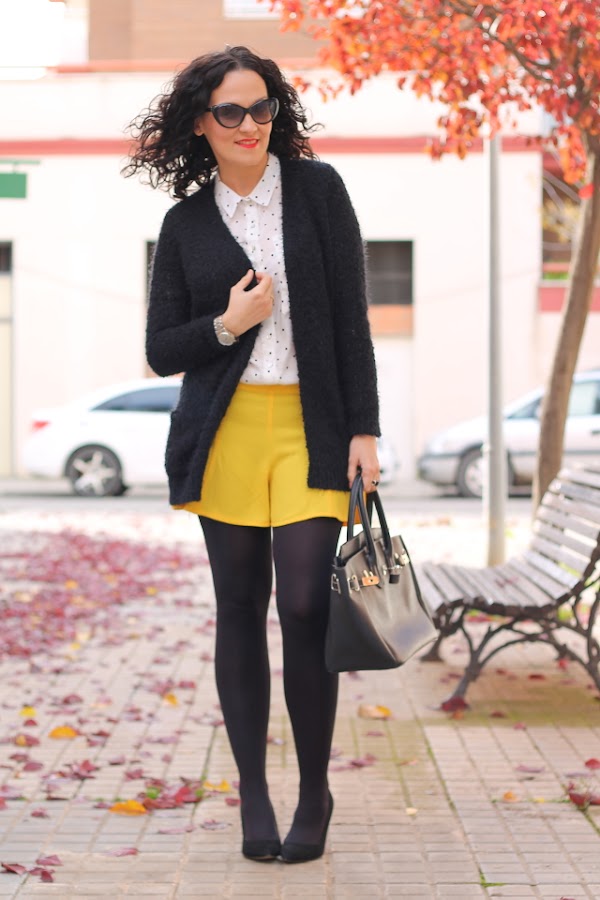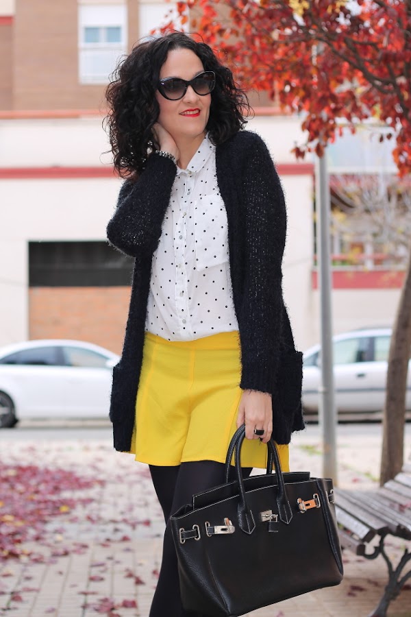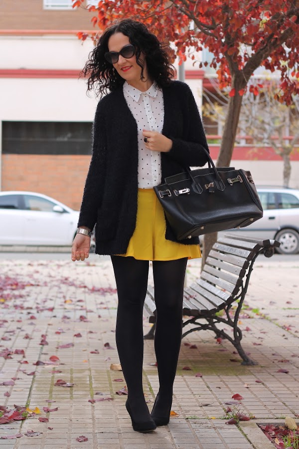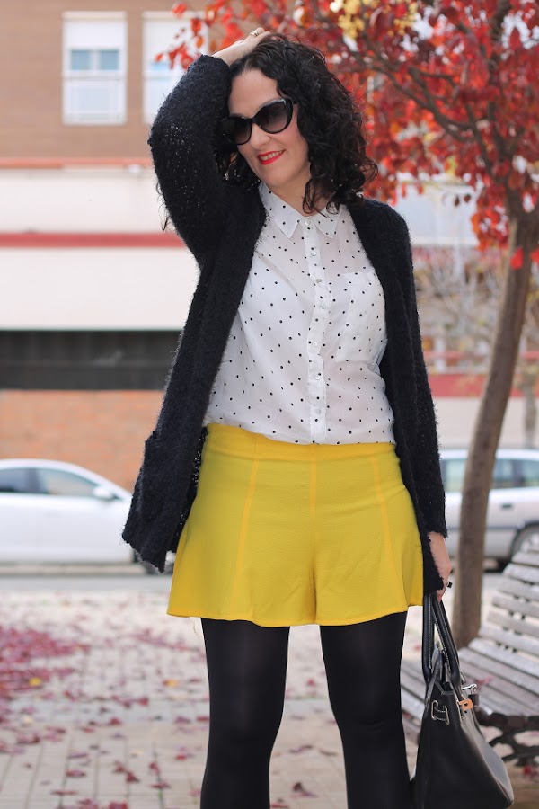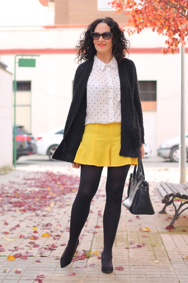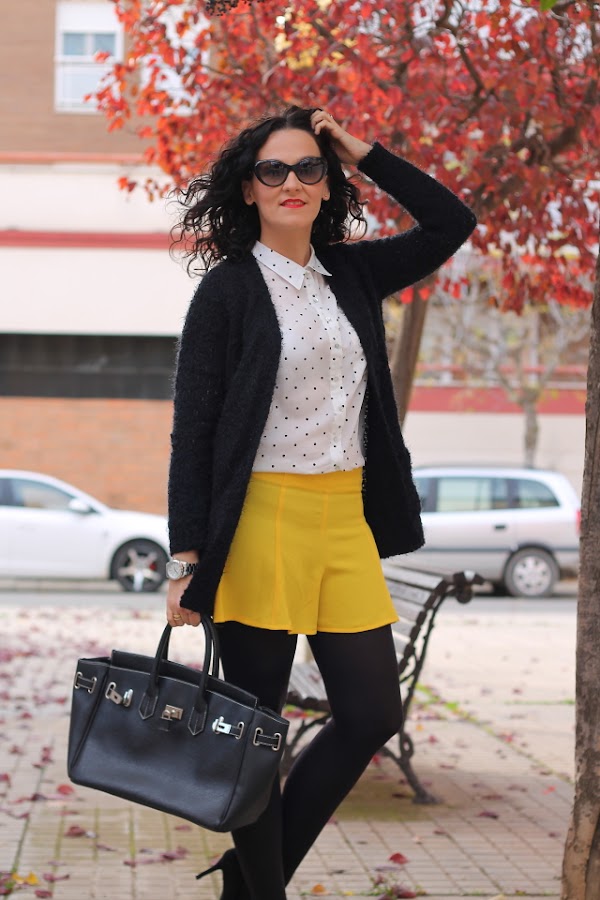 De nuevo otro look con mi camisa de topos favorita del momento, si ya os digo que cuando me da fuerte por una prenda no hago más que llevarla. Hoy me he decantado por combinarla con esta falda-pantalón amarilla que si recordáis ya os mostré aquí este verano. Además me he puesto mi nuevo cardigan negro que también veréis más veces por aquí, por su corte es ideal tanto para faldas como pantalones y lo mejor de todo que tiene un punto muy agradable y cálido.