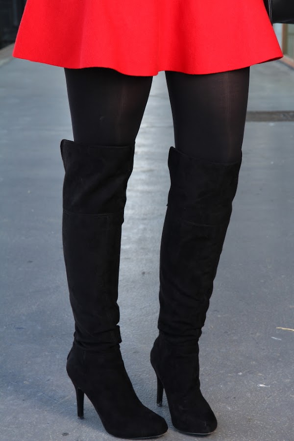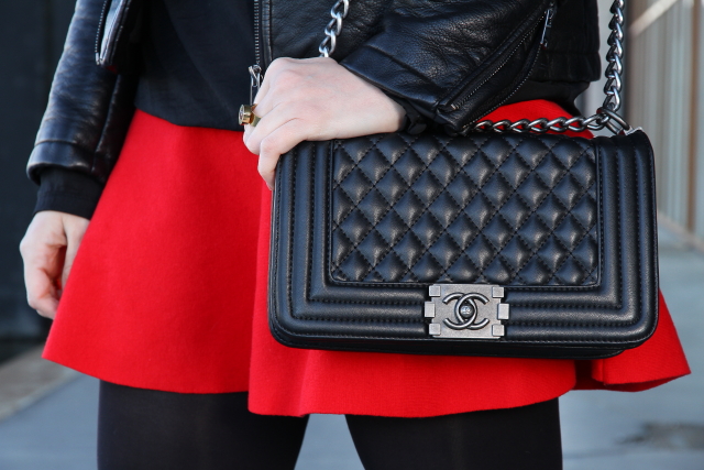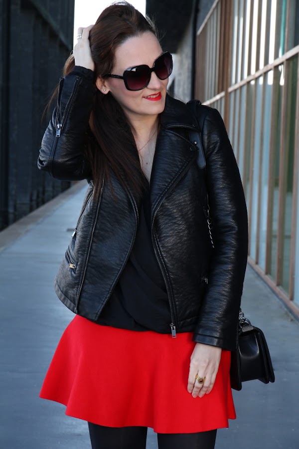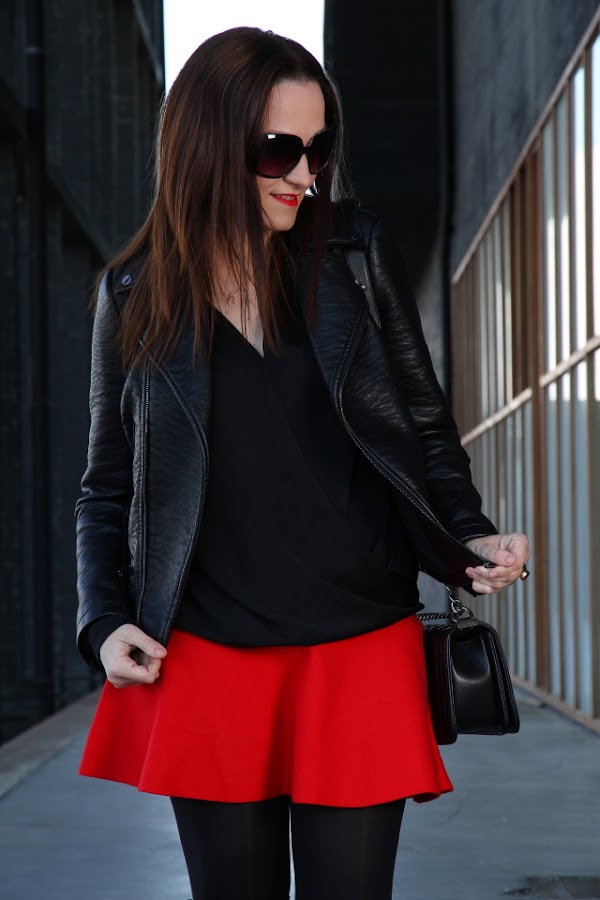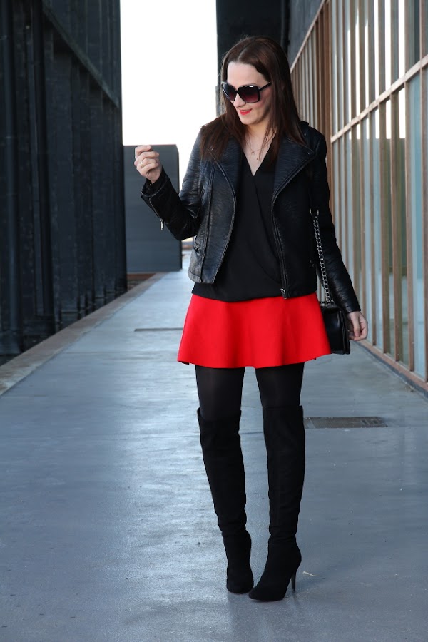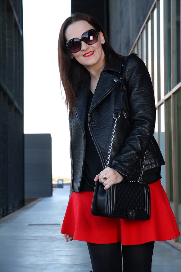 Me compré esta falda roja por el color tan bonito que tiene, pero es que ahora que la tengo, cada vez que me la pongo me gusta más por la fuerza que transmite a los estilismos. Un ejemplo es el outfit de hoy en el que le he dejado todo el protagonismo llevándola con un total look negro con biker y botas mosqueteras.