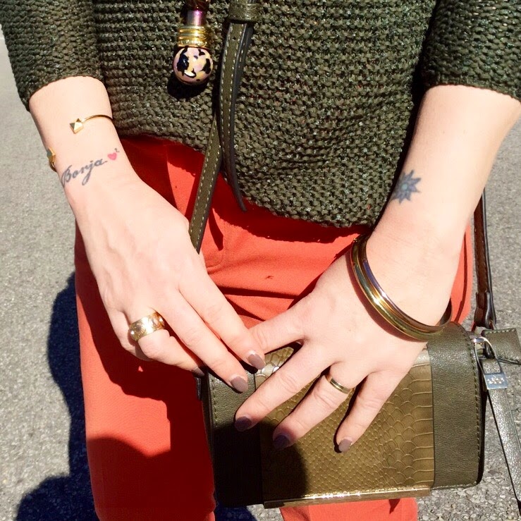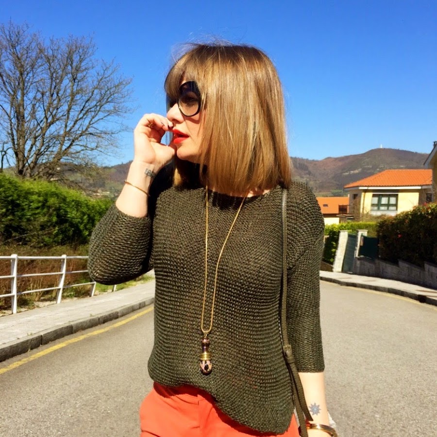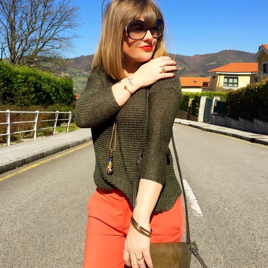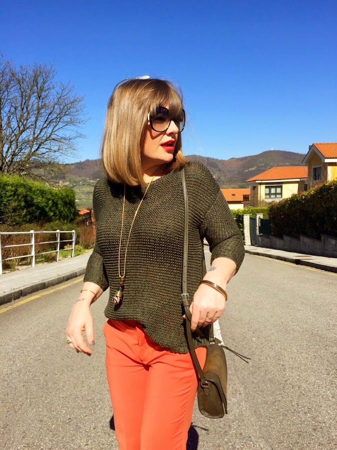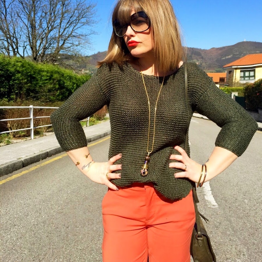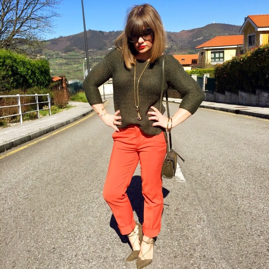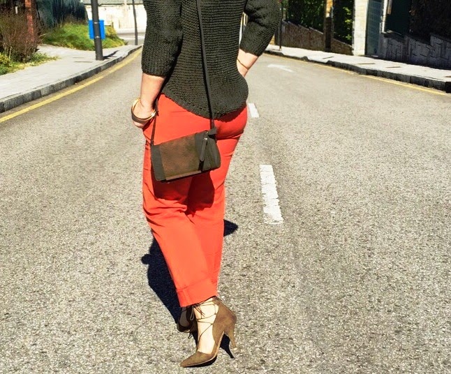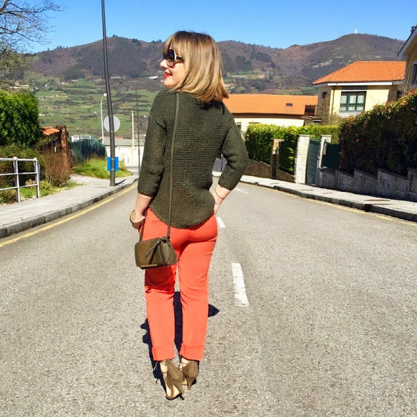 No tengo mucho que contaros sobre el look de hoy. Es sencillo y sin complicaciones, un pantalón chino en un color de nueva temporada combinado con uno de mis colores favoritos, el verde militar. Llevé este look el sábado, me esperaba un largo día de comida, sobremesa, tarde con niños.... Quería sentirme cómoda, pero después de muchos días con deportiva,s me apetecía algo distinto. Conseguí esa comodidad con estos zapatos. Tienen el tacón justo para aguantar todo el día.