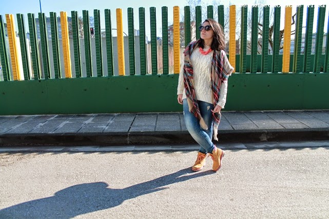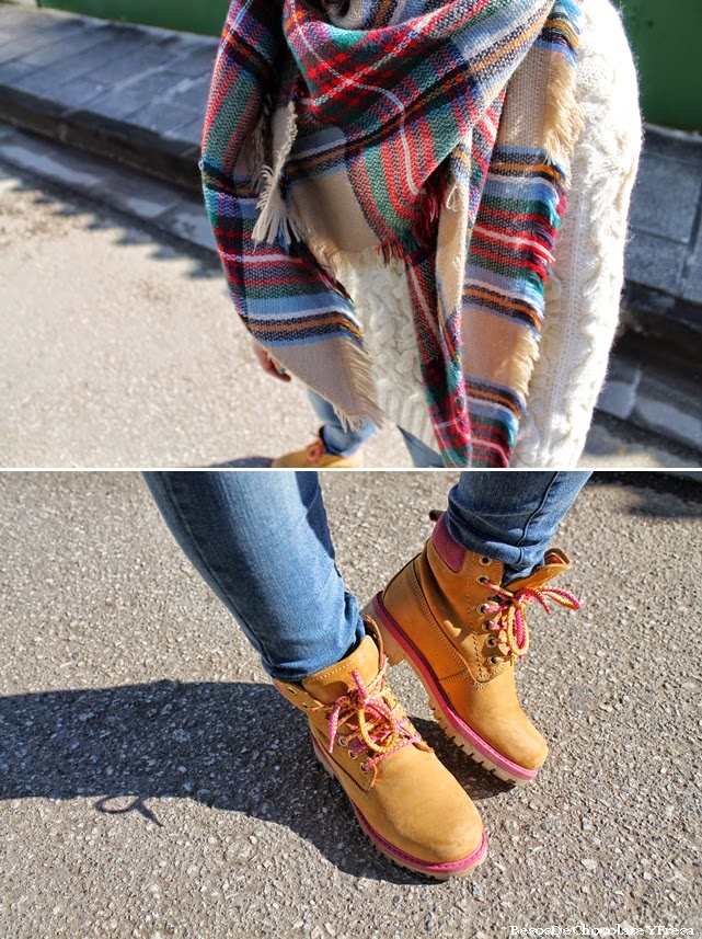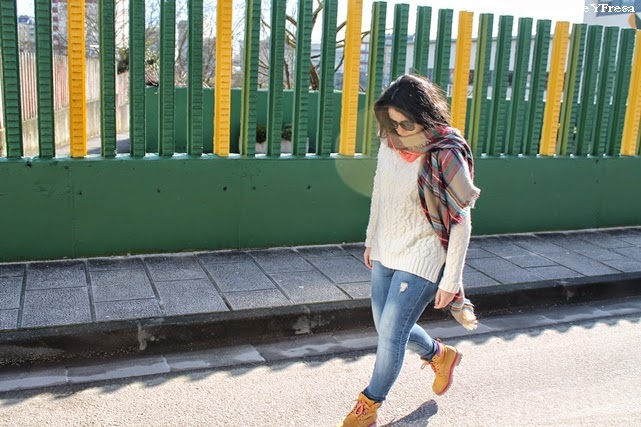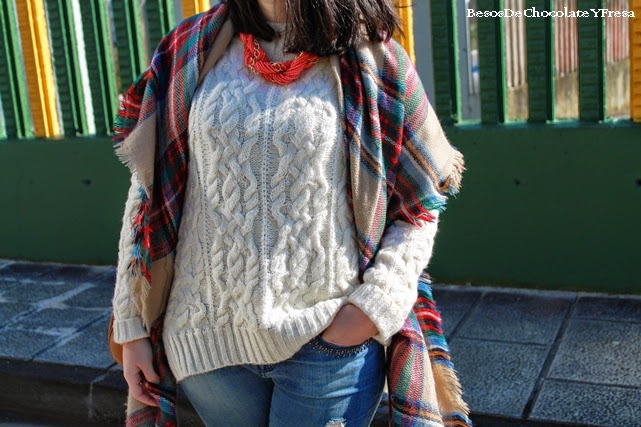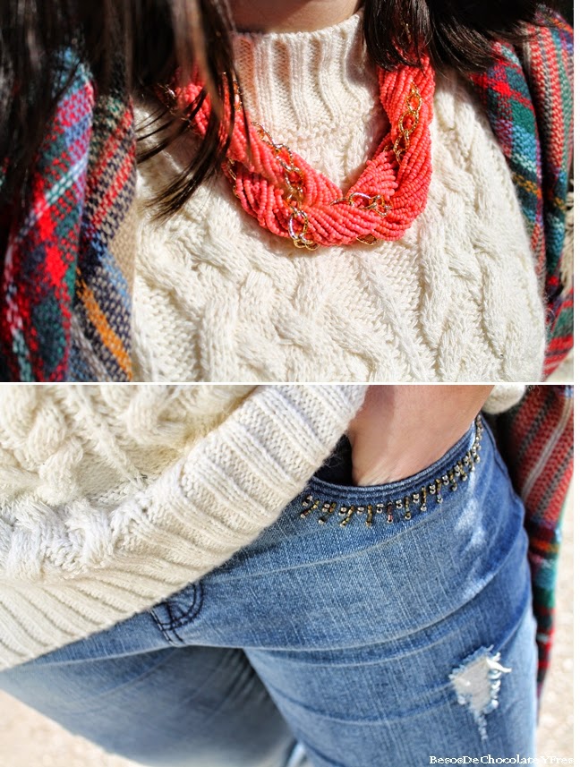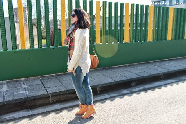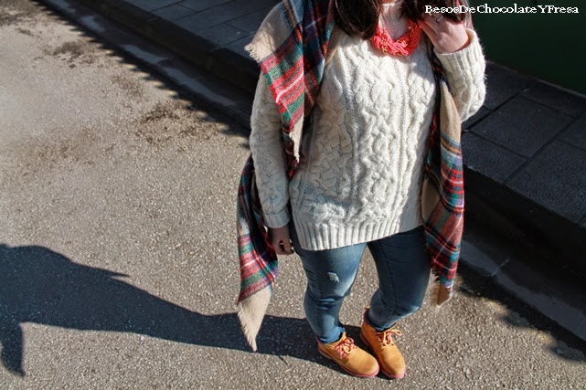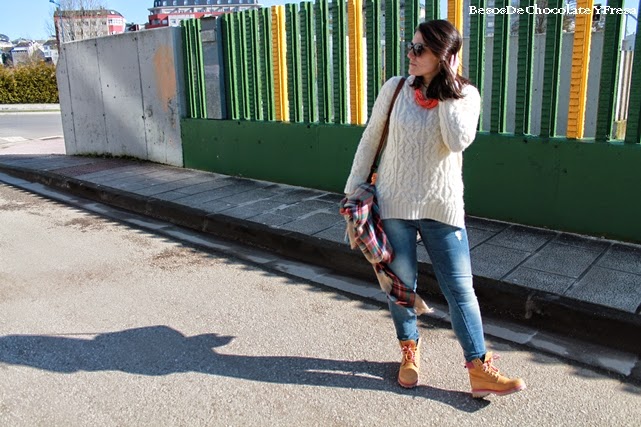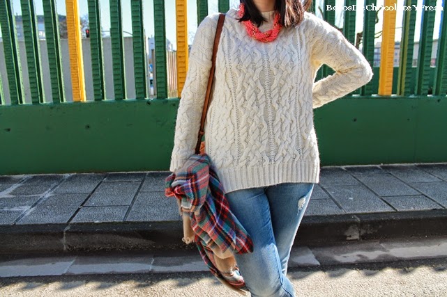 Llevo mi nuevo sweater de lana en blanco roto, jeans claritos y botas Fat Company con tonos rosados como el collar entrenzado. Bufamanta, bolso marrón y parka en verde con mangas de polipiel.