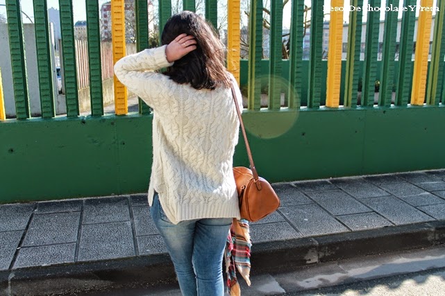 I wear my new sweater off-white wool, jeans and boots Fat claritos Company with pink shades like entrenzado collar. Bufamanta, brown bag and green parka with imitation leather sleeves.