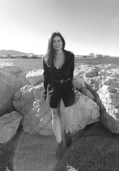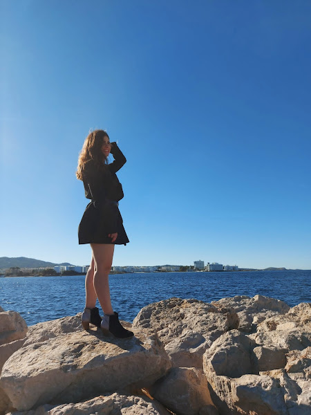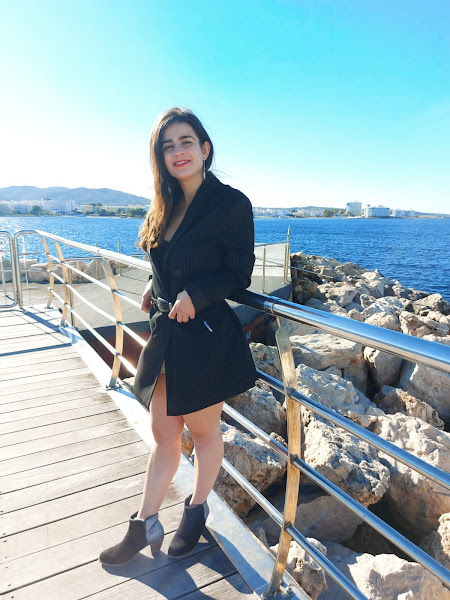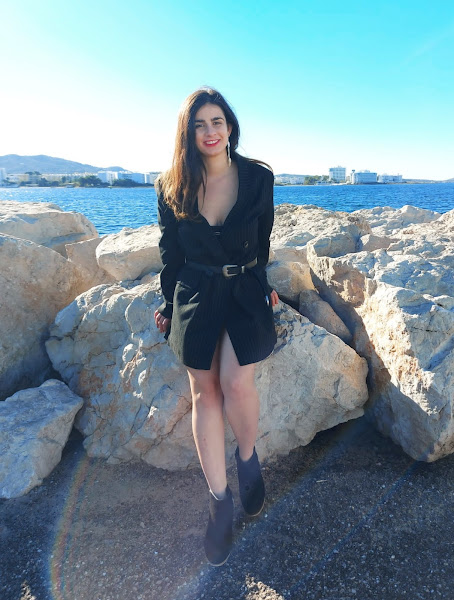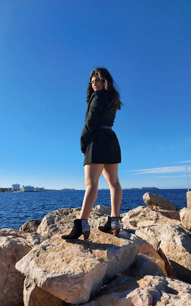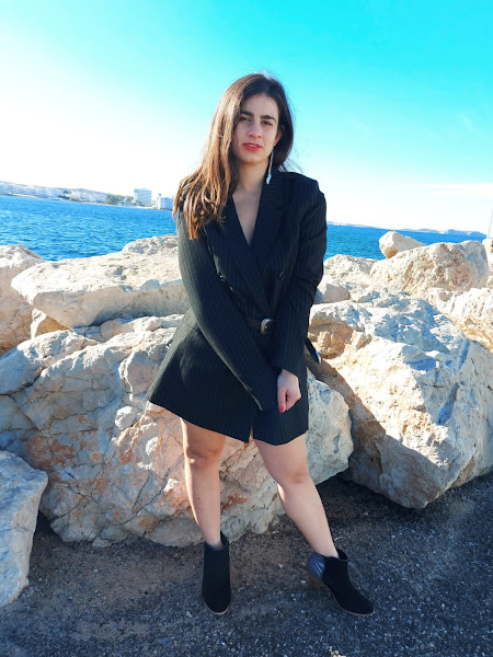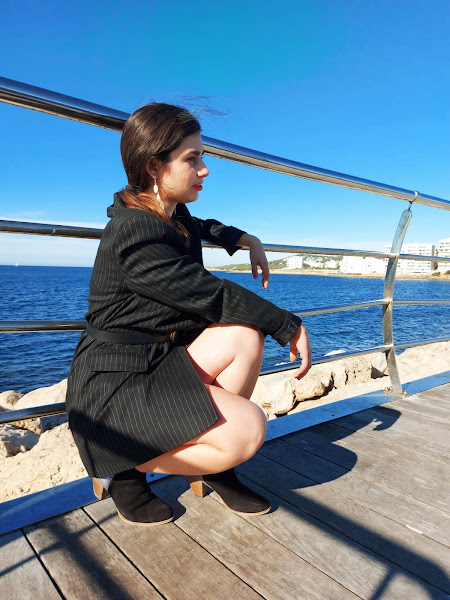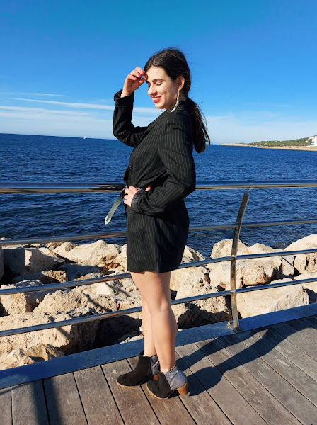 Este look es bastante diferente de lo que suelo llevar normalmente para estas fechas. Puesto que suelo optar bastante por vestido, falda o algún mono y esta opción es una americana larga negra de rayas que me va como vestido y a la que le he añadido un cinturón para que quede más ajustada. Además, todos los complementos son plateados tanto los pendientes como la parte trasera de los botines de la que estoy completamente enamorada y le da un toque muy elegante al conjunto.