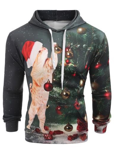 Christmas Tree Cat Print Drawstring Hoodie