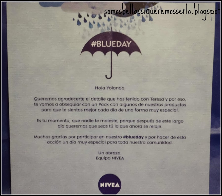 Nos mandaron un lote de productos a cada una y hace unos días recibí mi pack Blue Day y, con ésta carta de agradecimiento...