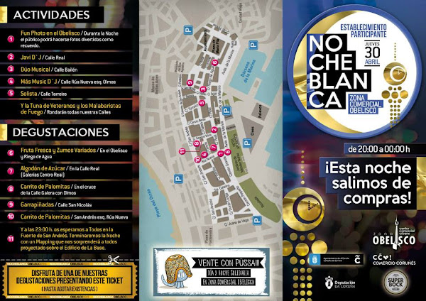 Mañana jueves, víspera de festivo, vuelve la noche de las compras al centro de nuestra ciudad. En la Noche Blanca organizada por la Asociación Comercial Obelisco, los comercios abren hasta las 12 de la noche con descuentos, regalos y degustaciones. Los participantes tienen un cartel en sus escaparates como este: