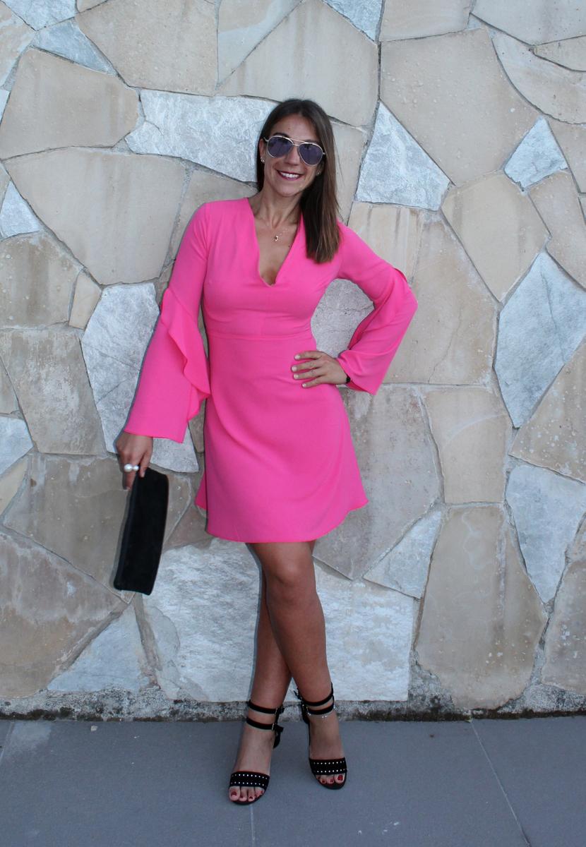 El vestido de un color rosa precioso, con un corte a la cintura, vuelo en la falda y escote pico, pero lo más bonito, quizá son precisamente las mangas, compuestas por una manga larga acampanada y adornada con un bonito volante que sale a la altura del codo hasta el puño. Por la parte trasera lleva un lazo que deja un trozo de espalada al aire.