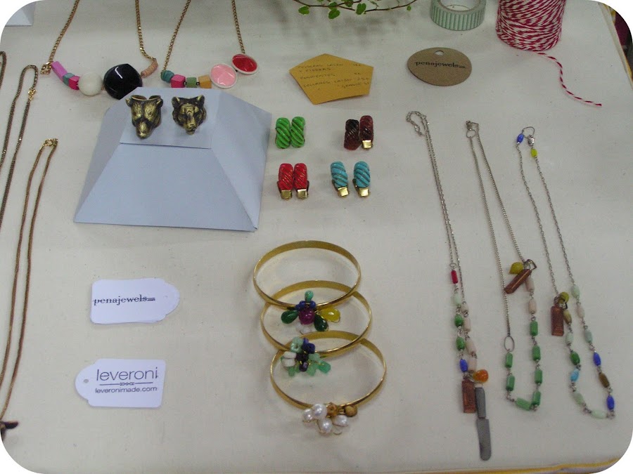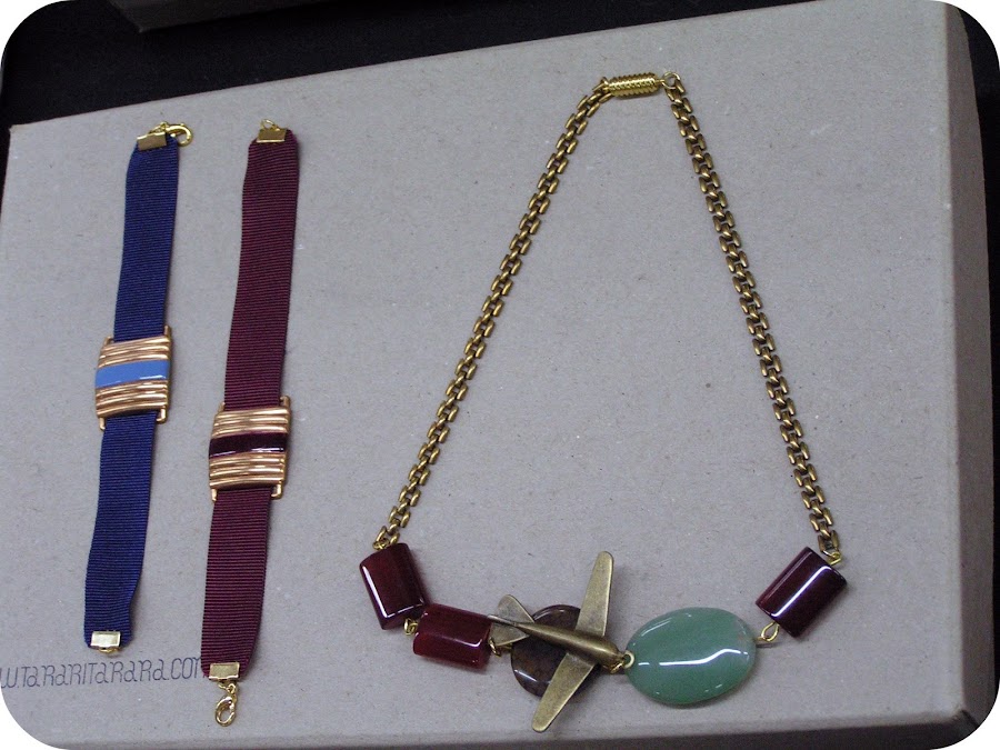 Esta chica me sorprendió ya en Molly Market, pero no tuve ocasión de hablar con ella y ver más de cerca todo lo que hace. Sus creaciones llaman la atención porque no pasan desapercibidas precisamente, son totalmente eclécticas y dejan ver la sensibilidad tan especial de su diseñadora. Cuellos, tocados, felpas, pulseras....Utiliza pasamanería antigua, objetos de taller de artesano, de mercerías de antaño, algo nuevo, algo viejo....todo se engarza con maestría para crear un objeto único porque no hay muchas piezas iguales sobre su mesa, me atrevería a decir que ninguna, y es difícil decidirse hasta que encuentras tu fetiche, como me pasó con una de sus pulseras.