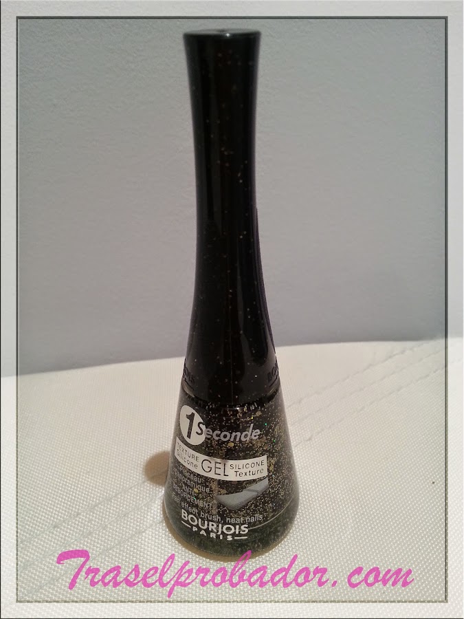 Es un esmalte muy bonito, con pequeños trocitos de purpurina (de diferentes tamaños) en varios tonos de verde y dorado. Deja un efecto muy bonito en la uña, y si bien nosotras no somos de llevar una manicura completa con este tipo de esmaltes, sí que nos gusta para decorar y adornar una manicura en general.