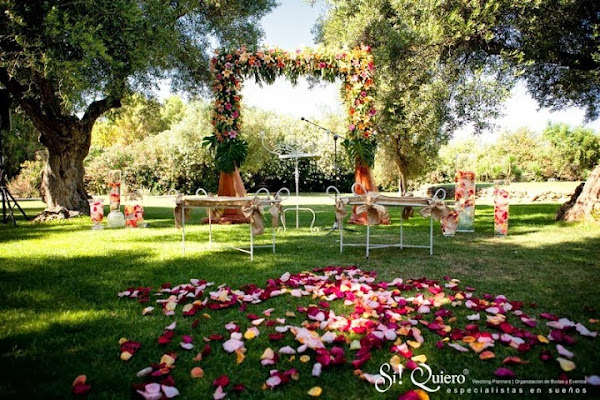 Los novios se dieron el sí quiero bajo un arco de flores de colores y estuvieron acompañados por una guitarra española que tocó en el momento que la novia hacía su entrada y durante la ceremonia.