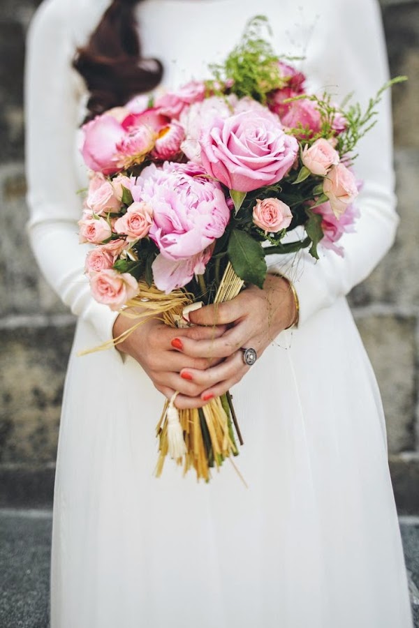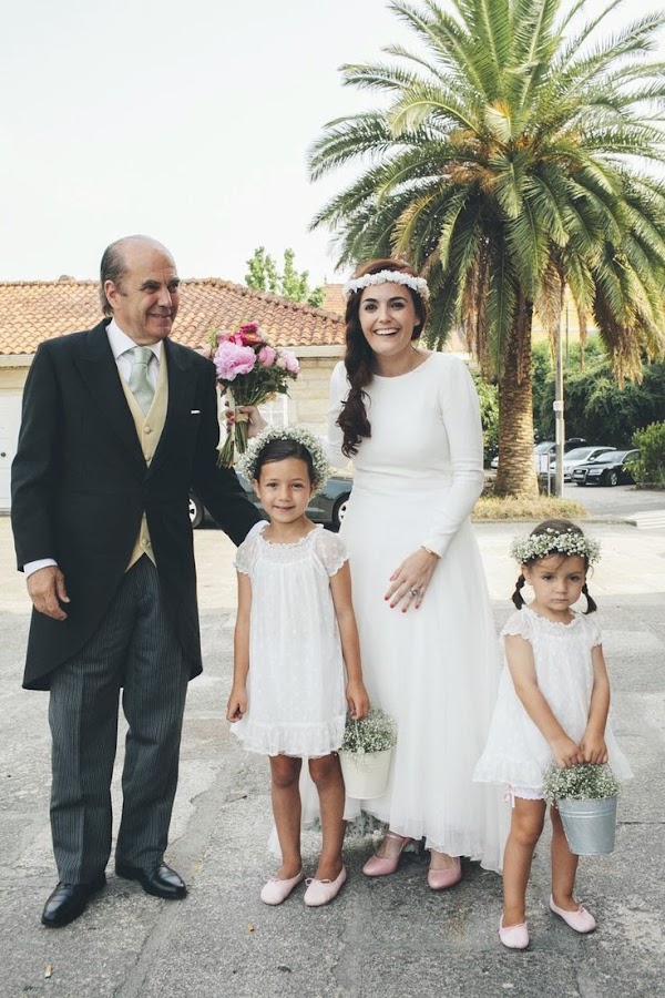 El vestido era espectacular. De manga larga, con escote en pico en la espalda y una botonadura maravillosa. El toque original estaba en su largura, siendo un poco más corto por delante dejando a la vista unos coquetos zapatos color rosa chicle de Miu Miu. El toque divertido lo puso llevando unos pololos bajo el vestido. Para el pelo escogió una coronita de flores y una trenza bucólica. ¡Radiante!