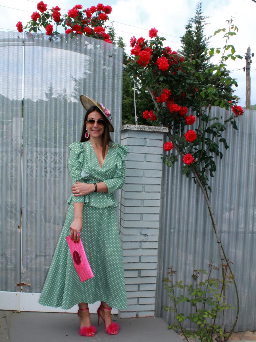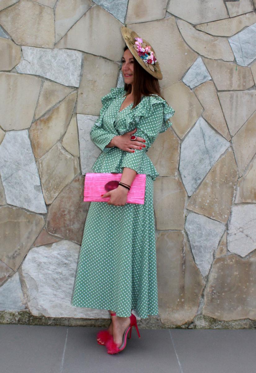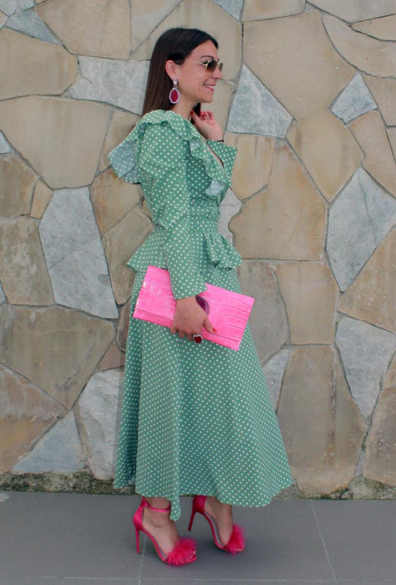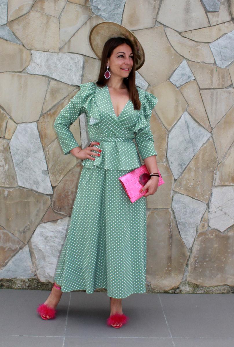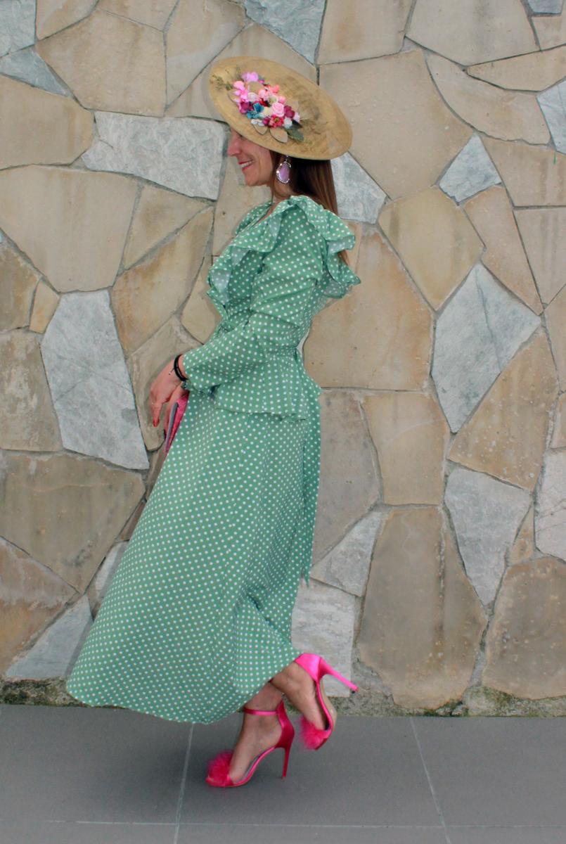 El outfit se compone de un vestido en color verde menta con pequeños lunares en blanco, con un corte midi y volantes adornando la parte delantera y los hombros. Combinado con sandalias de plumas en color fucsia a juego con todos los accesorios. Y para rematar, un conotier con adornos florales.