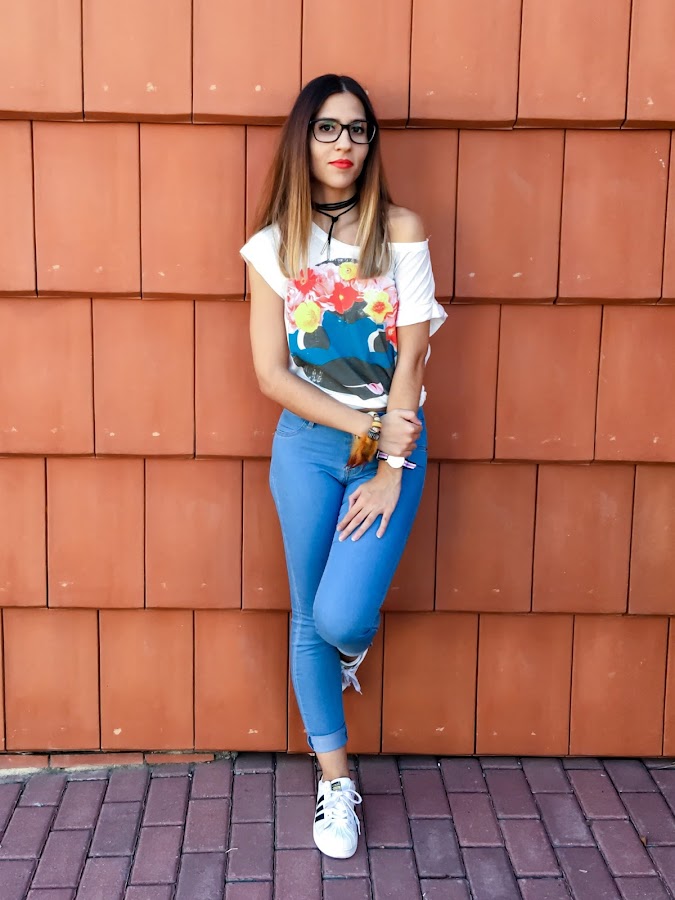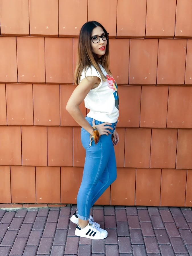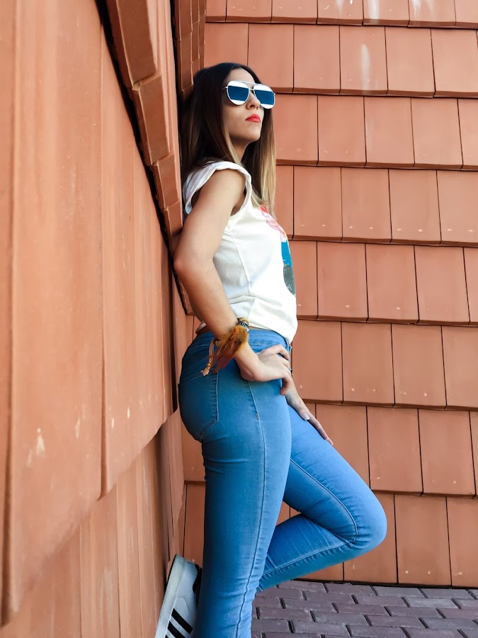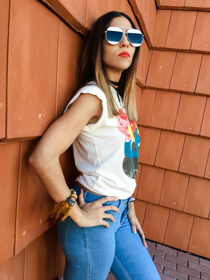 La he combinado con unos jeans básicos, y mis complementos perfectos, donde no falta mi pulsera de Dellmon.