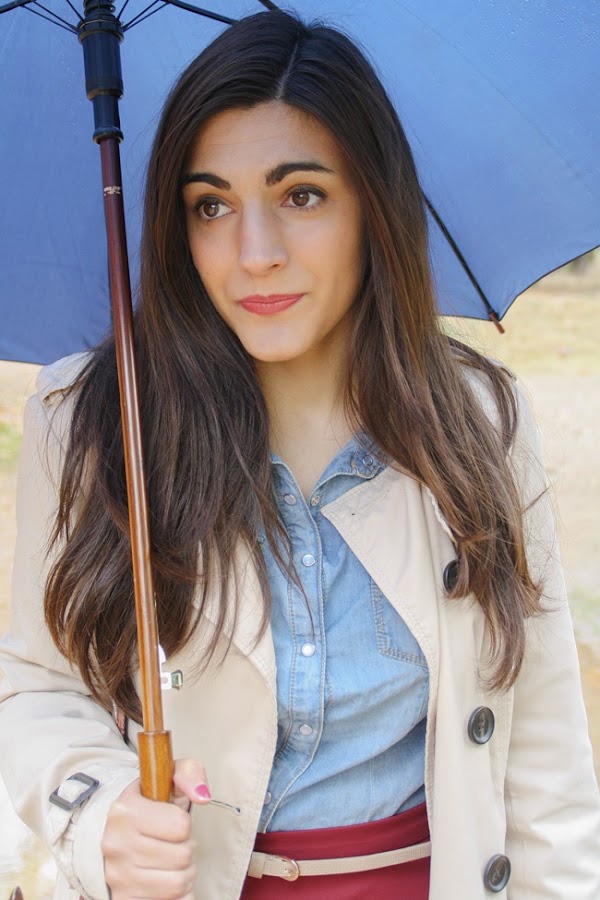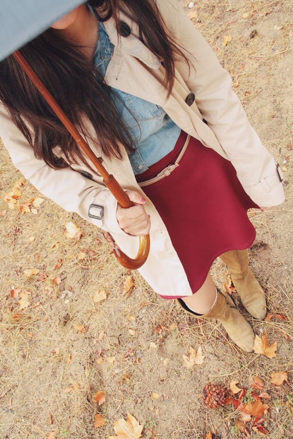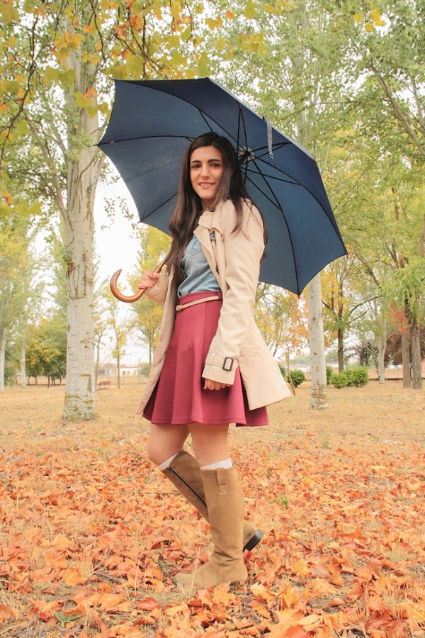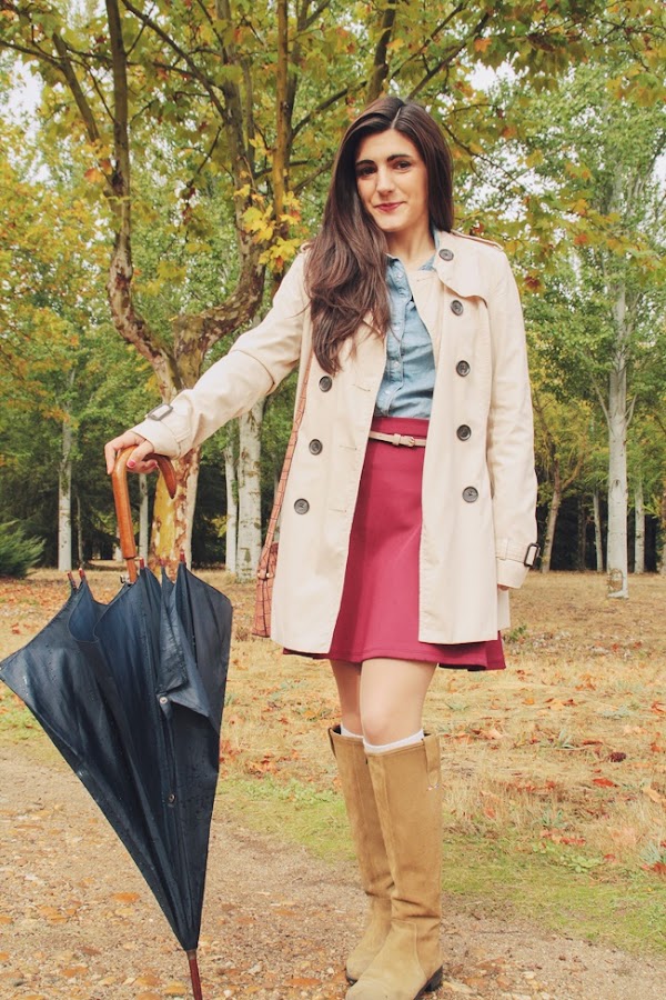 Está elaborado con prendas y colores muy otoñales. Una falda color burdeos, una camisa vaquera, una gabardina y unas botas en ante. Aunque parezca que haya podido tener frío, lo cierto es que nada más lejos de la realidad. Estuve muy a gusto, ya que todavía no hace tanto frío. Es una opción muy combinable, versátil y que se puede copiar fácilmente.