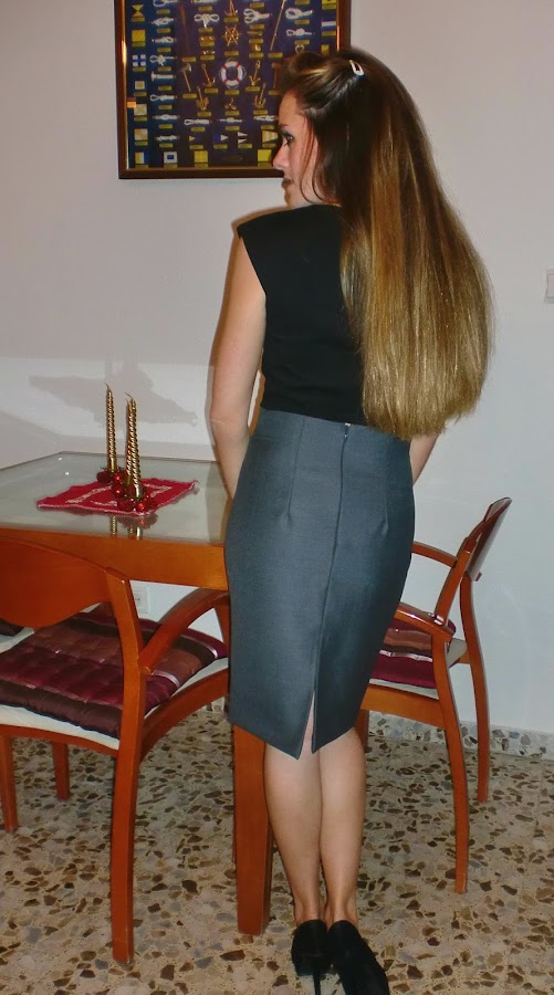 Es una falda en tono gris marengo, muy sencilla y básica, con pinzas de cintura, abertura trasera, cremallera invisible trasera y de cintura medio alta. Es un estilo muy formal y con un toque clásico.
