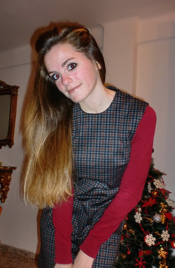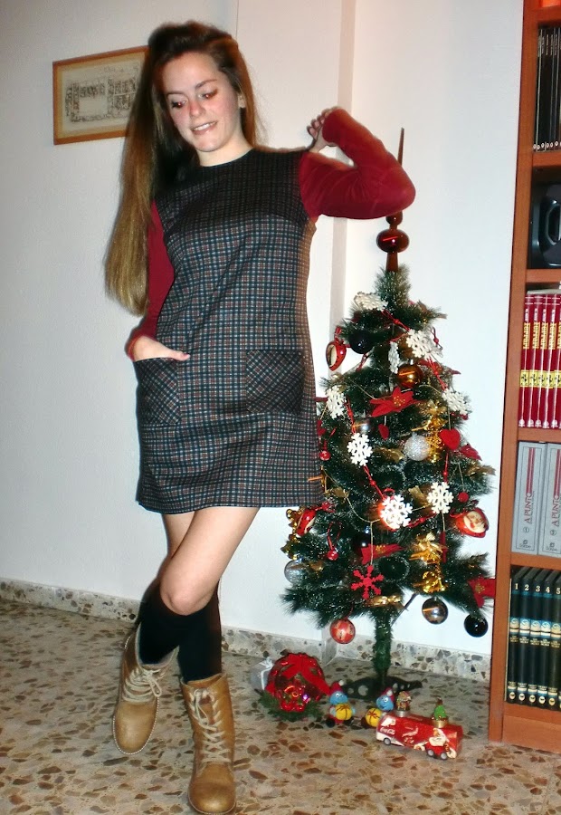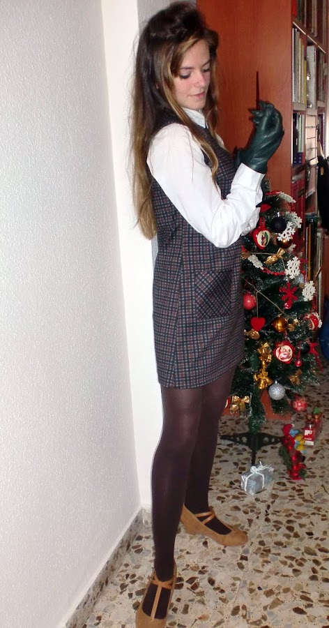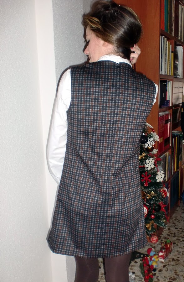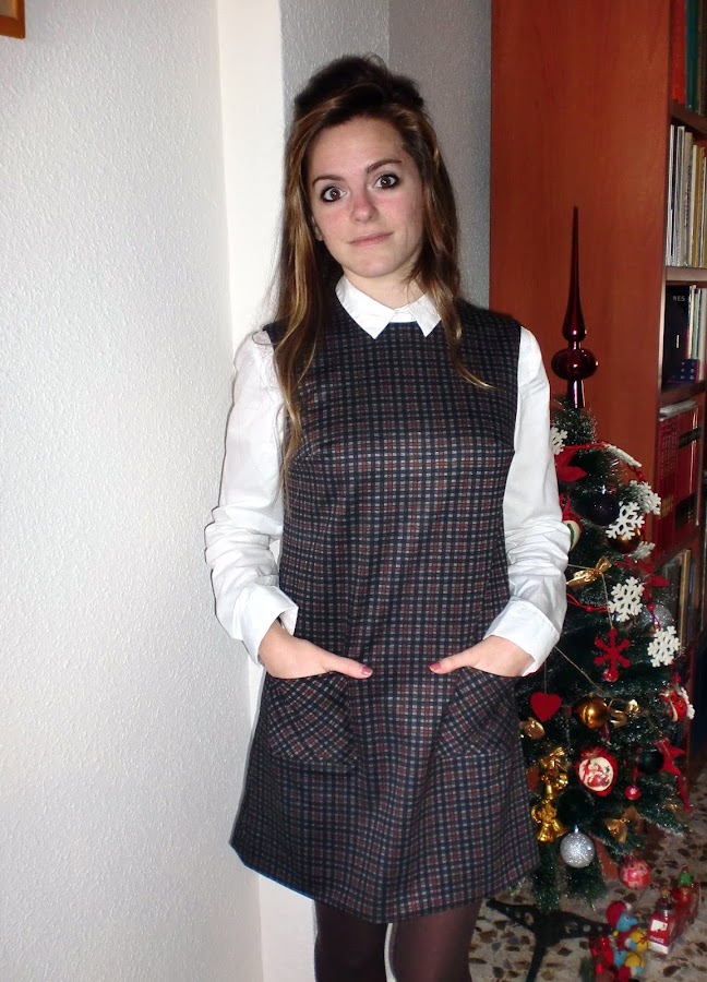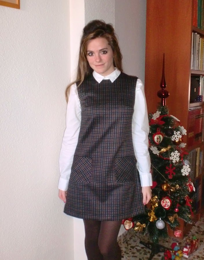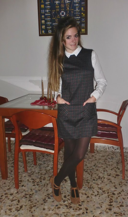 Este pichi es mi favorito de todas las prendas sin duda. Su estilo clásico y sesentero le da un toque muy especial, su diseño de cuadros en tonos oscuros hace que sea muy favorecedor para el invierno, semientallado, con escote a la caja, bolsillos de parche delanteros cortados al bies, cremallera trasera y unos 40 cm de largo desde la cintura. Se puede usar con camisa o jersey debajo, pero también podemos optar por llevarlo solo. Os dejo un montón de fotos con las diferentes opciones.