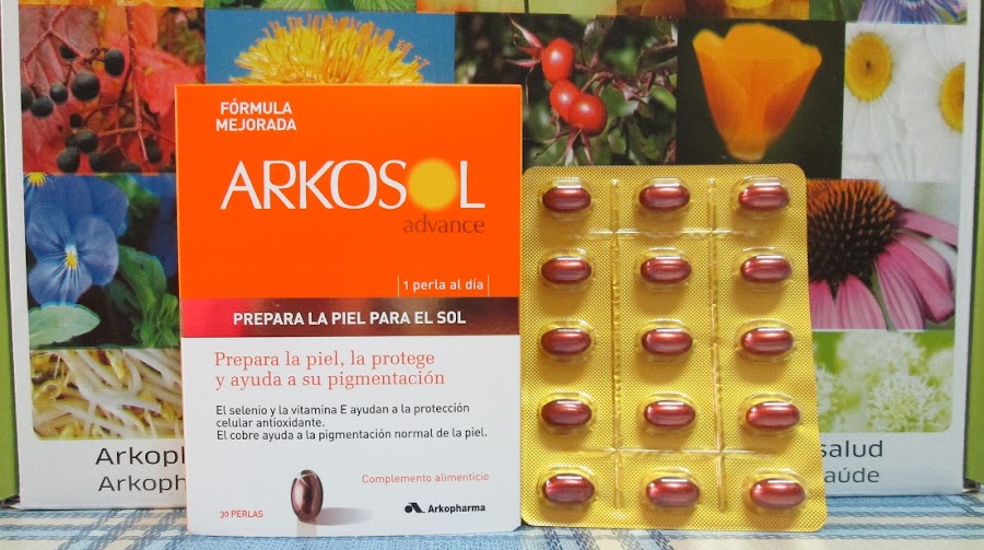 El primer producto que os presento, se trata de "ArkoSol Advance Perlas", que prepara y protege, la piel, del sol. Como sabréis, los rayos solares llegan a las capas profundas de la piel y causan daños, que a largo plazo, sino se toman las medidas apropiadas, pueden favorecer la aparición de cáncer de piel. Por ello, hay que utilizar protectores, al menos, media hora antes, de la exposición solar, cada dos horas y después de cada baño. También, hay que evitar el sol entre las 12:00 y las 16:00 horas, que es cuando las radiaciones es mayor, e hidratar nuestra piel con alguna crema, después de haber tomado el sol.