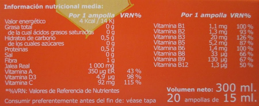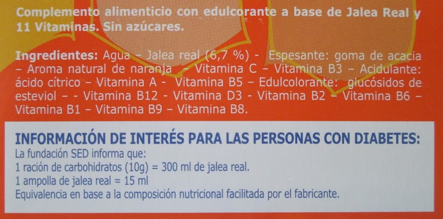 Para las que no lo sepáis, la jalea real es una sustancia fabricada por las abejas obreras jóvenes, que sirve de alimento a todas las larvas durante los primeros días de vida. Es por ello, que nos presenta este tentador producto, "Jalea Real"; sin azúcares, colorantes ni conservantes; y enriquecida con 11 vitaminas (A, D3, C, B1, B2, B3, B5, B6, B8, B9 y B12).