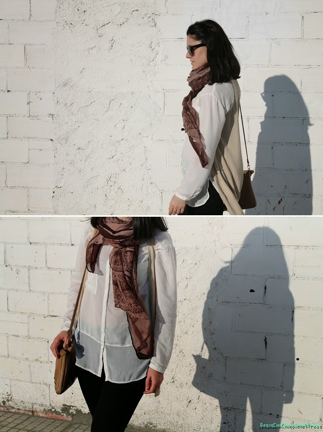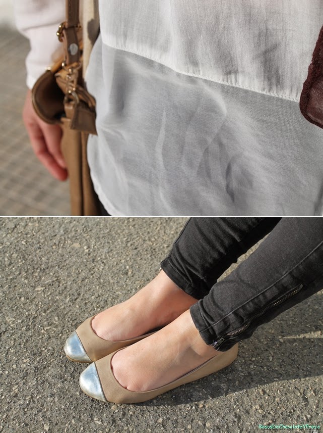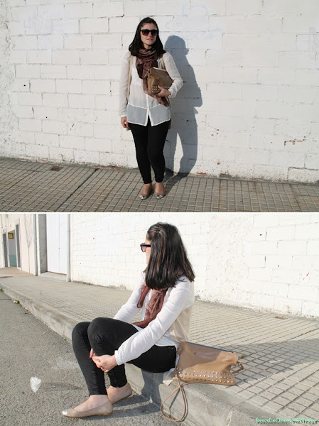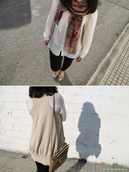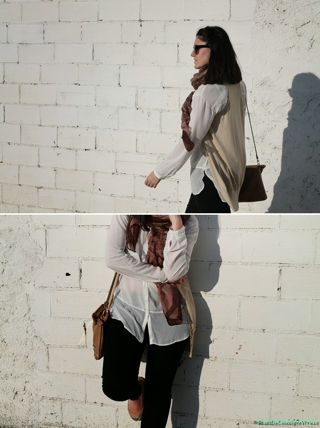 Hoy os enseño un look compuesto por tonos nude, blanco y negro. Para esta ocasión llevo camisa blanca con detalles en la parte de abajo en gasa y chaleco en color nude larguito, jeans negros con bailarinas y bolso bandolera en tonos nude.