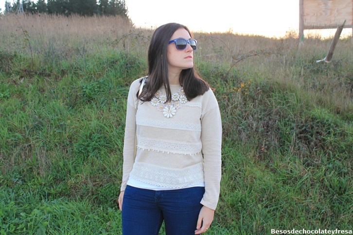 Hoy os traigo un look de hace varios días, cuando empezaba ya a venir este frio que te deja totalmente congelada. Llevo un look en tonos nude con poncho en blanco, sweater en nude al igual que el collar de flores, jeans, botas Fat Company, super calentitas con nota de color en rosa y bolso en dorado.