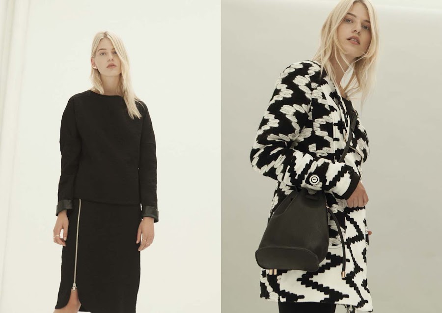 Otra parte de la nueva colección nos muestra prendas donde predominan los brillos, lentejuelas y efectos metalizados que podremos encontrar en vestidos con escotes muy femeninos en la espalda. También como protagonistas de la sección de estilo urban chic de la colección, encontramos cremalleras laterales en faldas, vestidos o abrigos dando movimiento a estos diseños. El bicolor del blanco y negro también aparecerá en distintas prendas con diseños geométricos como ponchos con flecos o jerséis de punto.