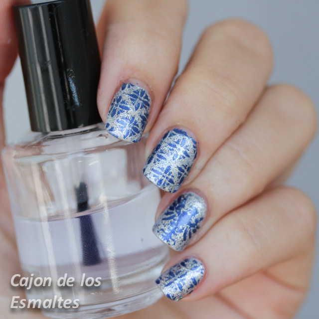 Y probamos ahora en las uñas un par de diseños. Suelo ponerme ansiosa por estrenar las placas cuando llegan y las uso inmediatamente con el esmalte que tengo puesto. En este caso fue el OPI - Shine for me que les mostré en el post anterior y no es la mejor elección ya que el glitter oscuro del esmalte hace parecer que el estampado dejó puntitos por todos lados. Pongamos que es un estilo de metal envejecido por lo que el diseño medieval va bien al tono.