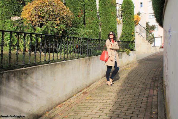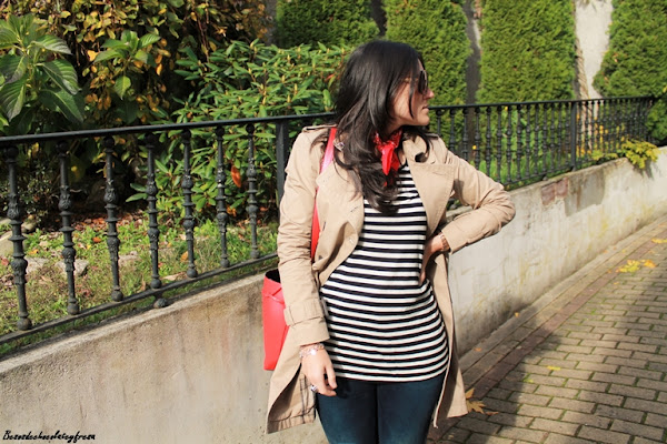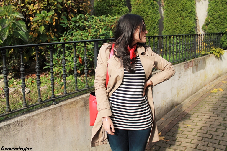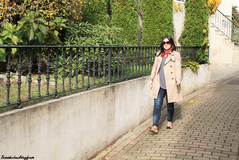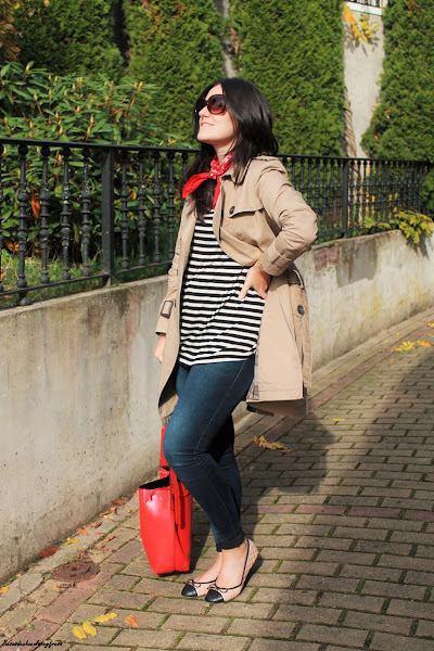 Compleo el look con jeans oscuros, camiseta holgada de rayas blanco y negro, trench nude a juego con las bailarinas tipo Chanel y bandana en rojo de mi tienda. ¿Qué os parece?