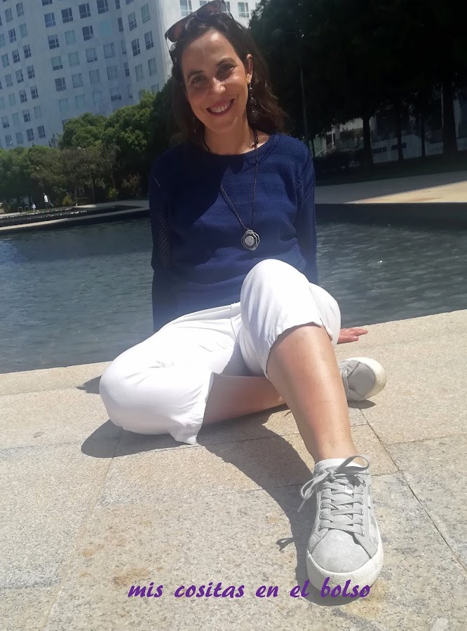El jersey que elegí fue este de color azul de cuello redondo, es un jersey que incluso podemos llevar con un top bajo. Yo lo estrené sin top, pero si con unos pantalones blancos piratas, un look informal y cómodo para estos días Pascueros que hemos tenido.